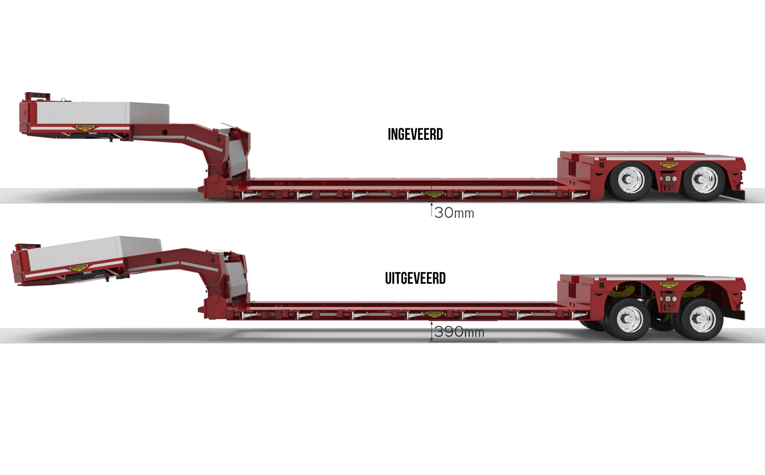 De SL2 heeft altijd 360 mm slag. Dit is bij diepladers belangrijk én ook bij semi-diepladers. Het vijzelen van grote ladingen, het op- en afrijden van ferry’s en het rijden over heuvels en rotondes zijn voor de gebruikers de voornaamste redenen om te kijken naar een grotere slag. Daarnaast creëert de SL2 bij een semi-dieplader zelfs meer bodemvrijheid dan bij een maximaal uitgeveerde pendelas semi-dieplader, aldus Broshuis.