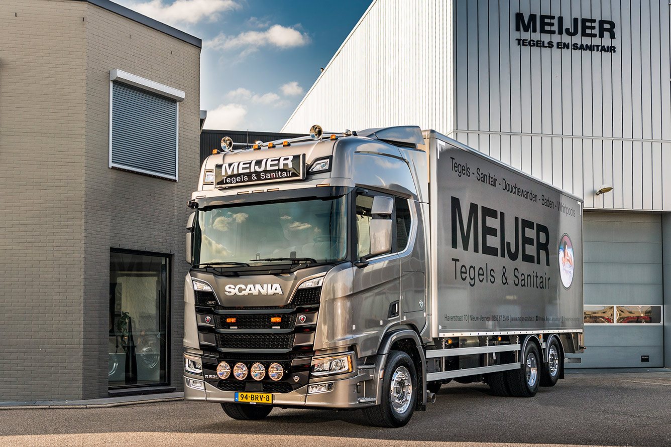 Meijer Tegels & Sanitair uit Nieuw-Vennep heeft voor het eerst Scania gekozen om de tegels, badkamers en accessoires bij hun klanten te bezorgen. De familie Meijer staat bekend om hun passie voor auto’s, het is dan ook niet gek dat de eerste Scania direct een opvallende verschijning is geworden. De 3-assige bakwagen is voorzien van een R-cabine met hoog dak en de sterke en goed klinkende 520 pk V8. Eigenaar Daan Meijer: “We wilden het graag in één keer goed doen.”