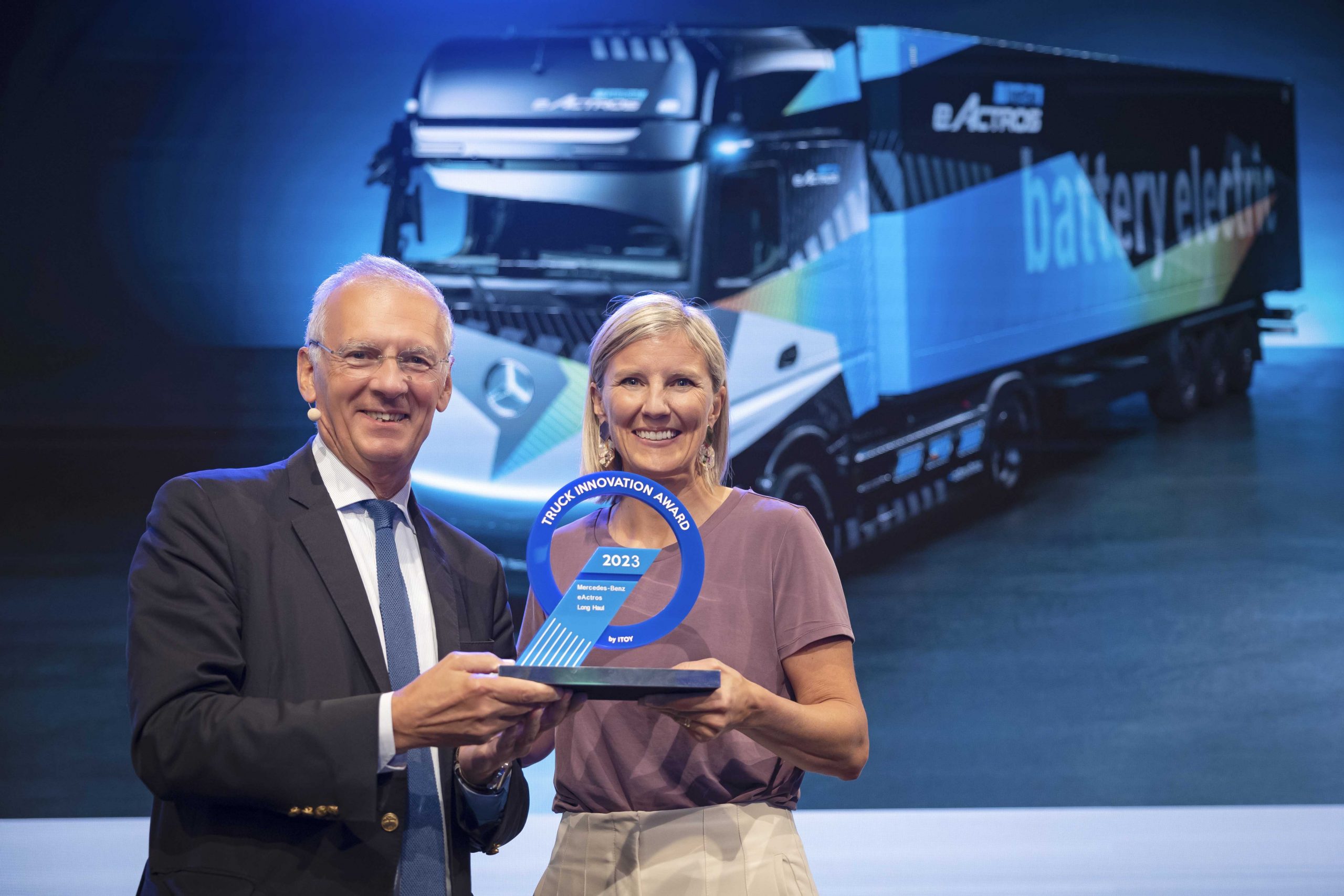 Karin Rådström, CEO van Mercedes-Benz Trucks, ontving de prijs uit handen van Gianenrico Griffini, voorzitter van de IToY-jury, tijdens een evenement op de IAA Transportation 2022 in Hannover. Doorslaggevend voor de stemming was het innovatieve algehele technologische concept met LFP-batterijtechnologie, de nieuwe e-as en de hoge ontwikkelingssnelheid van Mercedes-Benz Trucks.