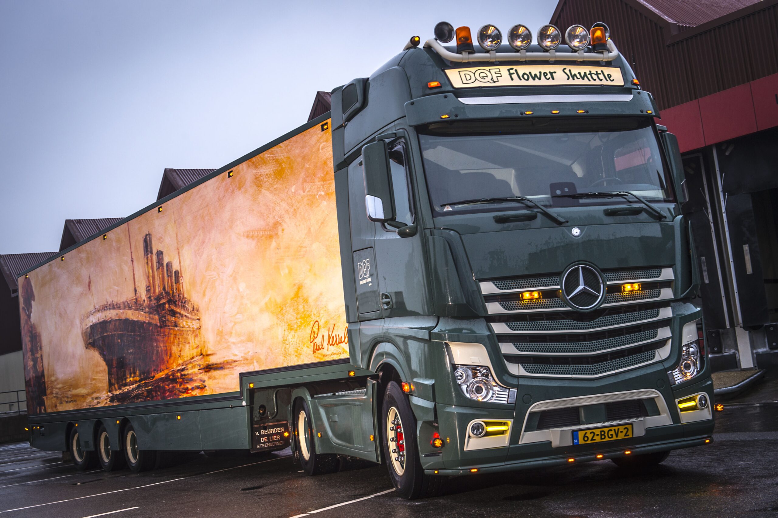 Waar het uiterlijk bij sommige transportbedrijven een ondergeschikte rol speelt, vindt Marco Duivenvoorden de uitstraling van zijn vrachtwagens belangrijk. De groene bloemenauto’s zijn dan ook te herkennen aan de luxe opleggers die door schilder Paul Kerrebijn zijn verfraaid met afbeeldingen van schepen en treinen. “We hebben er daarom bewust voor gekozen om de trekkers zo rustig mogelijk te houden,” vertelt Marco Duivenvoorden. “De Actros heeft van zichzelf al een strak uiterlijk. Het enige wat we nog moesten doen, was de trucks in dezelfde kleur als de oplegger spuiten.”