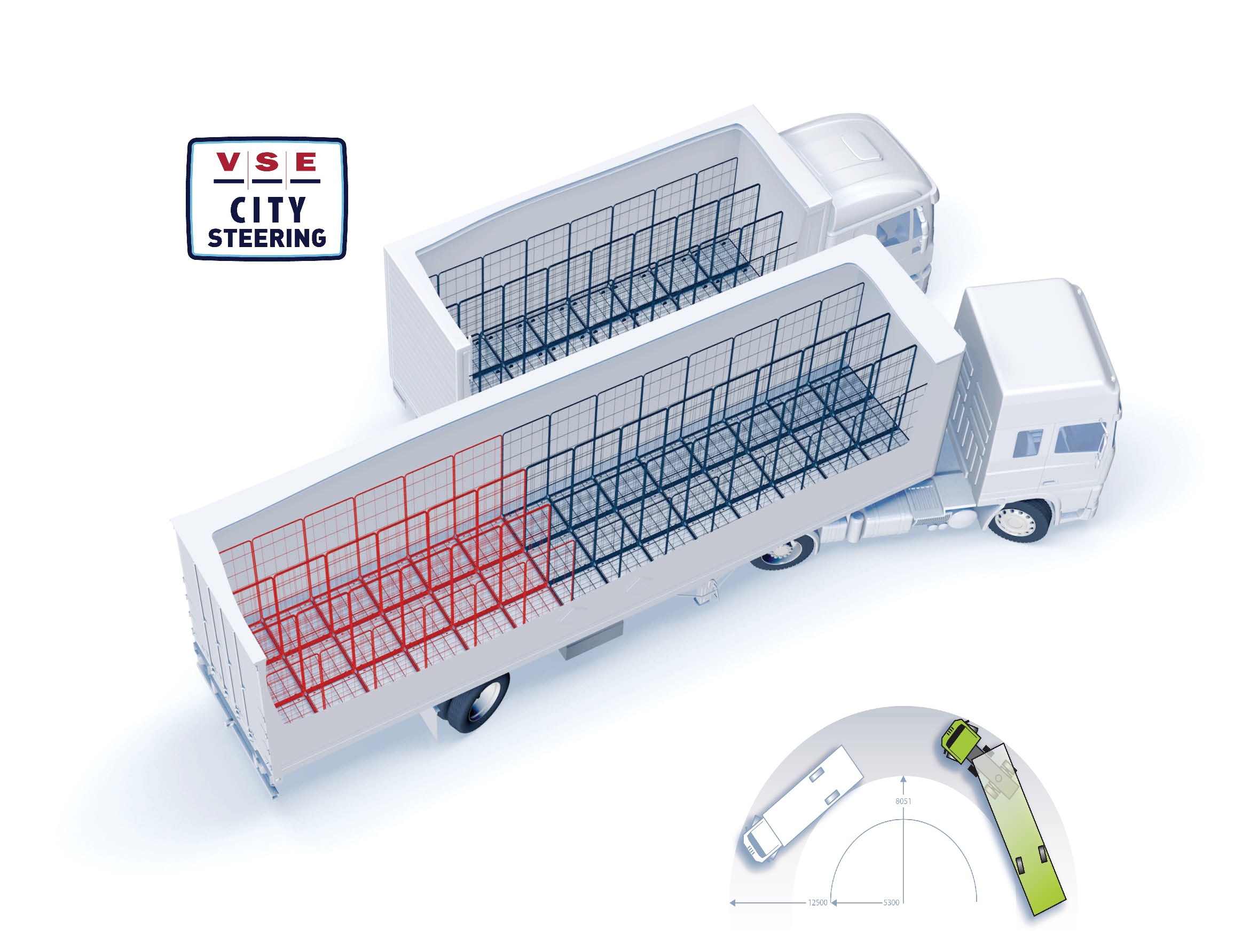 Het nieuwe stuursysteem van VSE voor de achteras is in totaal 300 kilogram lichter dan vergelijkbare systemen. Het neemt ook minder ruimte in beslag: dat betekent dat de laadruimte vijf tot tien centimeters aan laadhoogte kan winnen. Het systeem kent geen draaikransen of andere smeerpunten: VSE heeft voor de nieuwe citytrailer besturing speciale software geschreven, die exact is afgestemd op de inzet van dit type trailer. Dit is belangrijk want alleen zo kan de wendbaarheid waar de citytrailer om bekend staat, optimaal gegarandeerd worden.