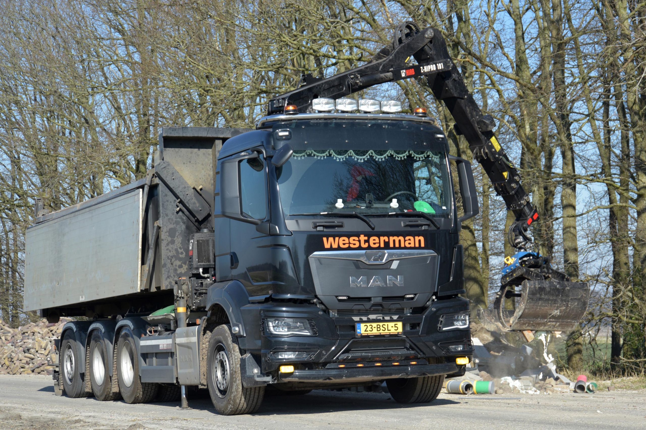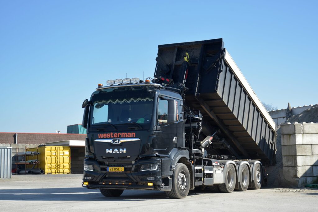 De compleet af fabriek geleverde MAN 8×4-4 heeft met zijn D26 krachtbron met 470 pk voldoende power in huis om ook met de dieplader- aanhangwagen uit de voeten te kunnen. Met de Hiab Z-Hipro 191 autolaadkraan en het Multilift Ultima 26 haakarm- afzetsysteem was de truck pasklaar voor de toepassing van Westerman. Met een afzetbare kipperbak met milieukleppen vormt de nieuwe MAN een ‘knijper-kipper’ voertuig zoals dat in de aannemerij veel voorkomt. Dankzij de twee aangedreven assen kan de truck ook uit de voeten in licht terrein of op onverharde wegen. Door de sturende, liftbare achteras is het bovendien een bijzonder wendbaar voertuig, handig bij bestratingswerkzaamheden in de binnenstad.