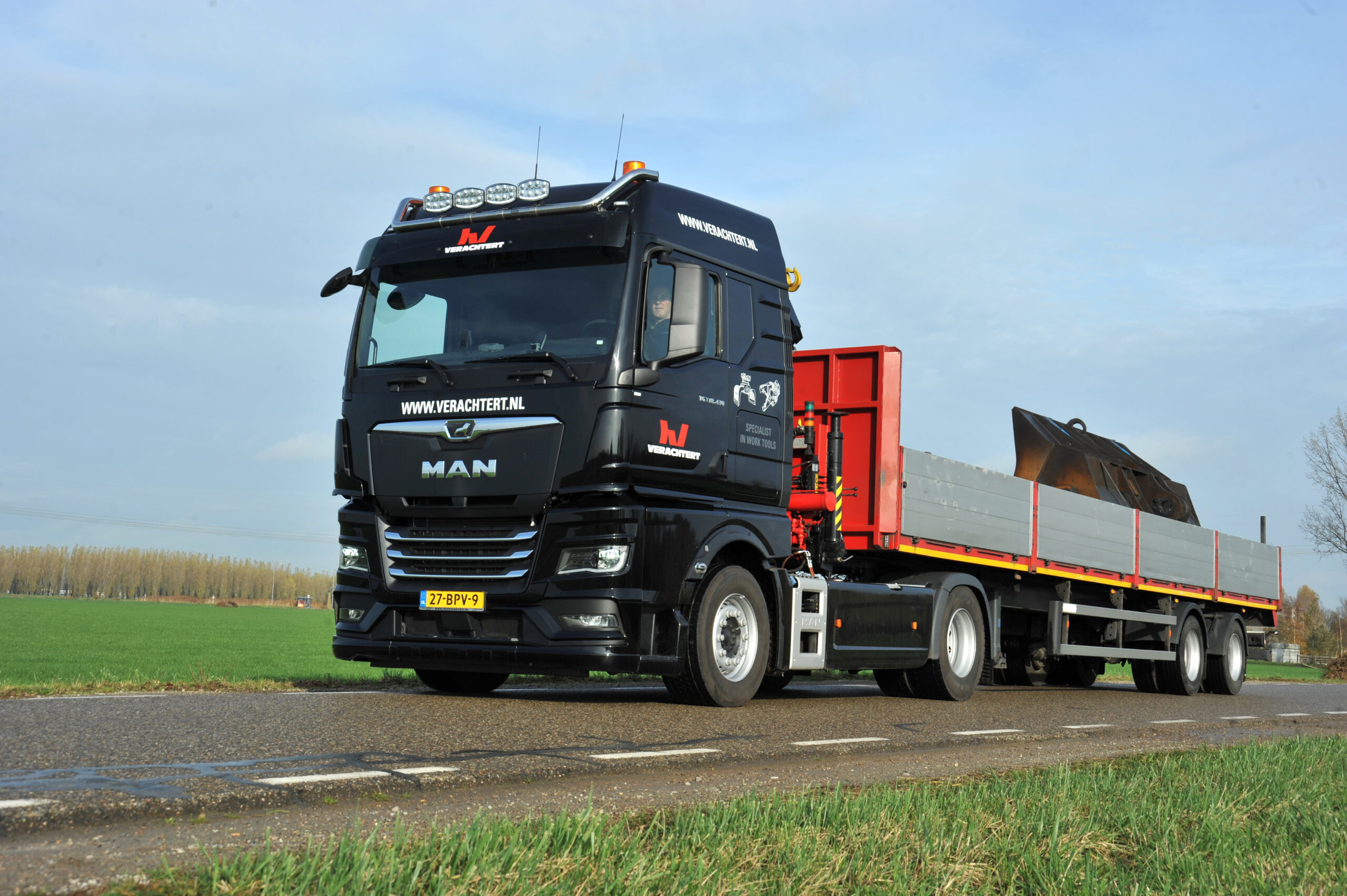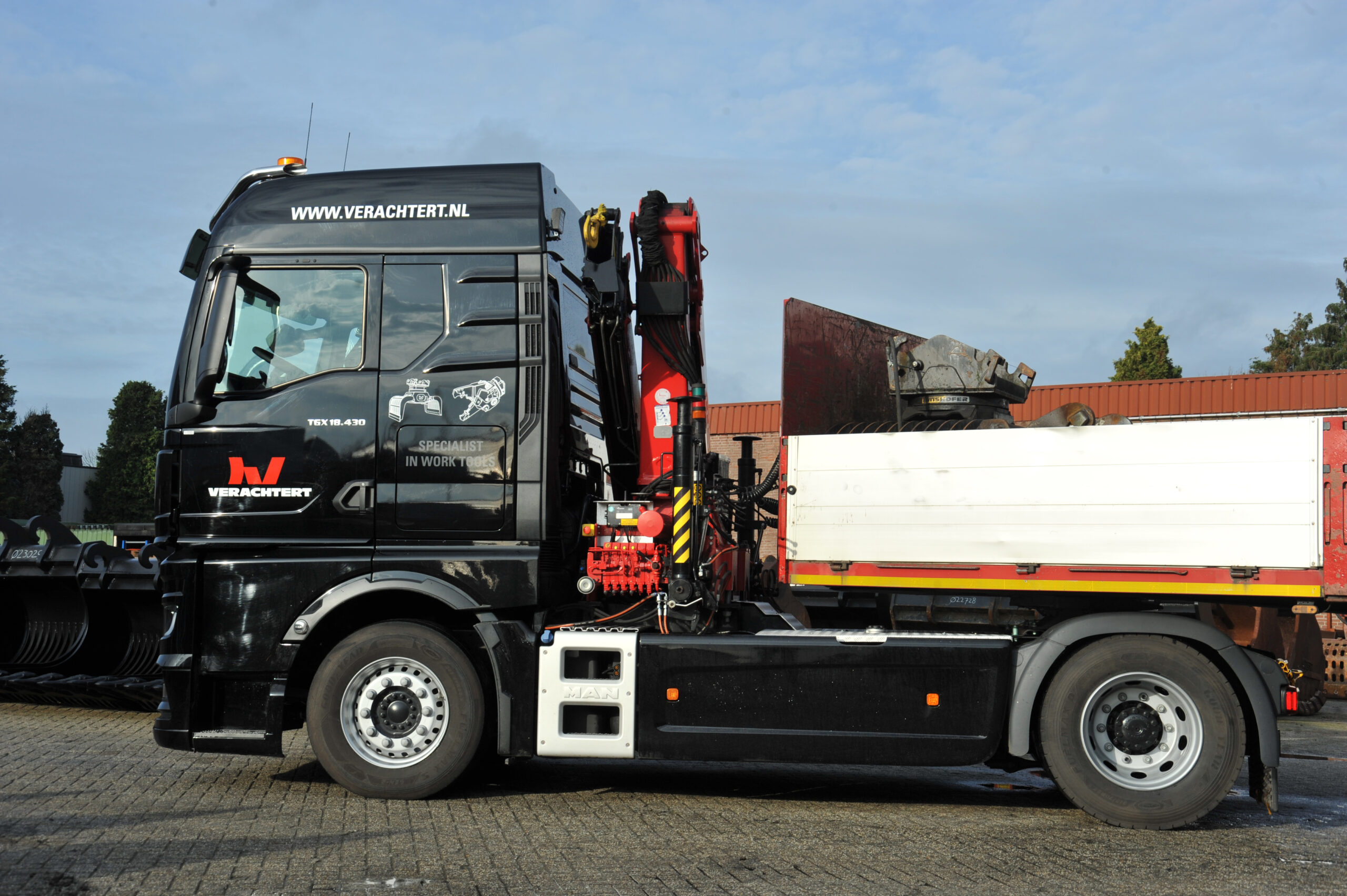 Chauffeur André Janssen rijdt vast voor Verachtert.nl, een bedrijf dat ‘work tools’ maakt voor graafmachines. André: “Verachtert maakt en doet onderhoud aan allerlei grijpers, graafbakken, sloopscharen en andere hulpstukken voor hydraulische graafmachines. Ik rij dagelijks met die hulpstukken door Nederland en België voor de aan- en afvoer. Om die reden heb ik een open oplegger en een autolaadkraan achter de cabine waarmee ik zelf kan laden en lossen.” Om de autolaadkraan op te kunnen bouwen koos Stefan Geerts voor de 3,90 m lange wielbasis. Geerts: “Ik had die kraan nog staan en die heb ik zelf opgebouwd. Het is een HMF 22 ton/meter kraan en dat volstaat voor dit werk. Door de opbouw in eigen huis konden we snel aan de gang met deze nieuwe auto. De complete opbouw was in twee weken klaar.”