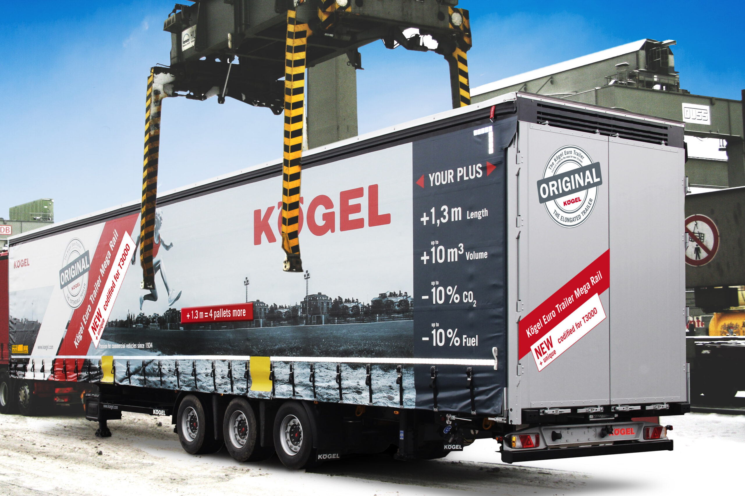 Trailerfabrikant Kögel presenteert op de aanstaande Transport Logistic Beurs in München (9 tot en met 12 mei) een nieuwe volume-oplegger.De zogenoemde Euro Trailer Mega Rail is 1,3 meter langer dan de langste Kögel-oplegger tot dusver.