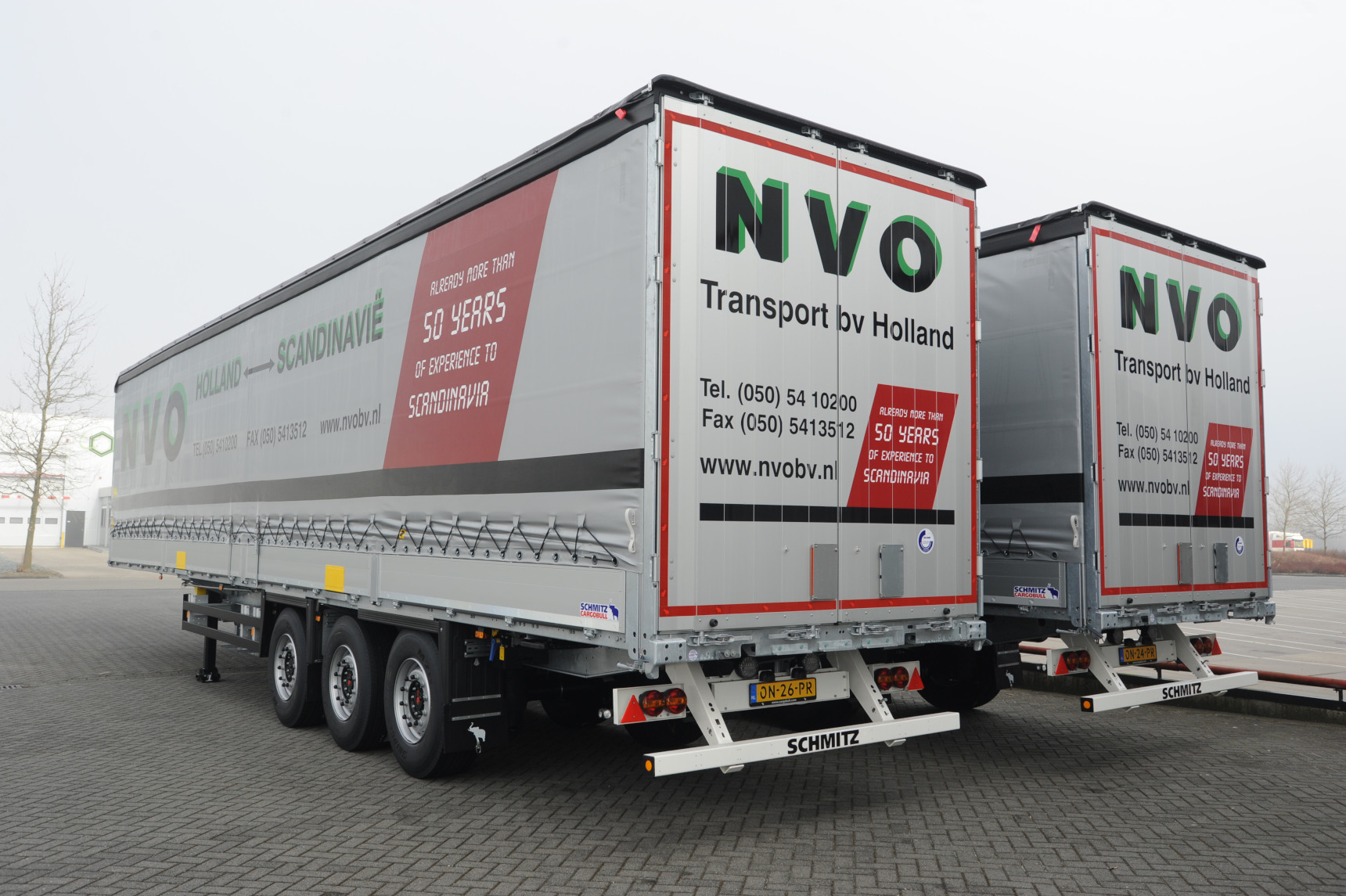 De nieuwe Schmitz Cargobulls zijn uitgevoerd als huckepackoplegger. Op die manier zijn ze binnen de NVO universeel inzetbaar op alle routes. De opleggers hebben extra rongen, een TÜV-certificaat voor ladingzekering en een schuifdak. De keuze voor Schmitz kent een aantal redenen: ‘Ten eerste vinden wij de duurzaamheid van de verzinkte materialen erg belangrijk. Wij doen vrij lang met ons materieel en hechten er aan dat het er representatief uit blijft zien. Daar komt nog bij dat we prima ervaringen hebben met Schmitz Cargobull. Vooral de levering van onderdelen bij onderhoud en reparatie gaat soepel’.