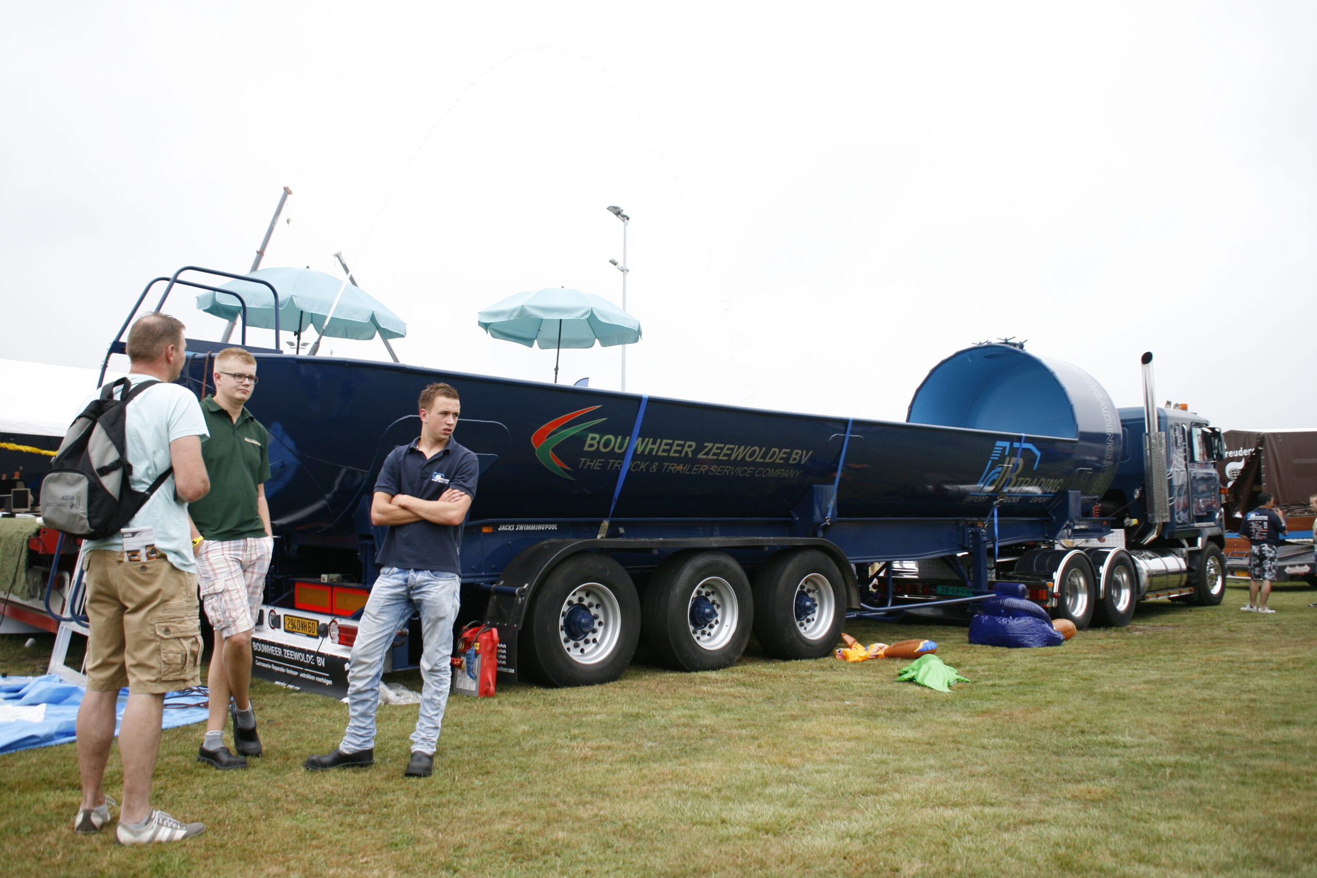 Al lopend over het circuit, waar ruim 1700 werktrucks staan opgesteld, wordt je omarmd door gezelligheid, vrolijke muziek en wonderlijke vondsten. Zoals de grote badkuip van JB Trading, oftewel Jacks swimmingpool. Vorig jaar ontstond het idee bij Jack Brouwer om een bukoplegger aan te laten passen naar zwembad en het resultaat is verbluffend!