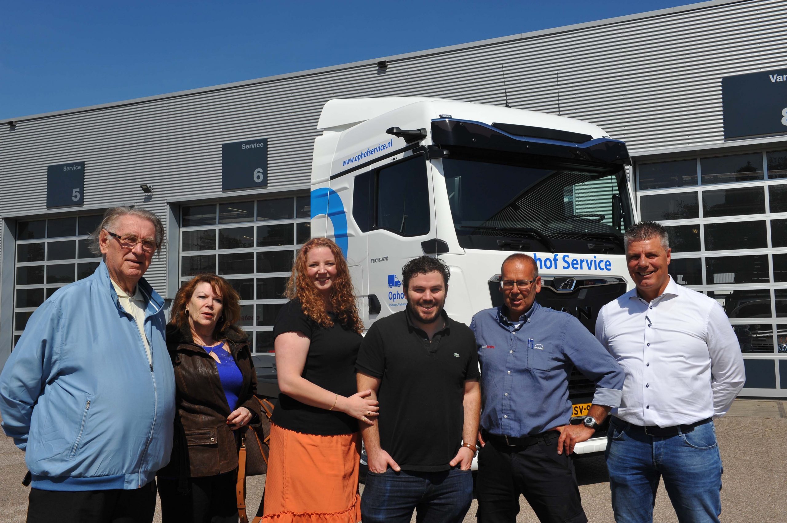 - Op de foto vlnr: Dhr. en mw. Ophof sr, Angel en Alexander Ophof, Cees Hoogland en Michel Schroots van Van Leeuwen Truckservice.