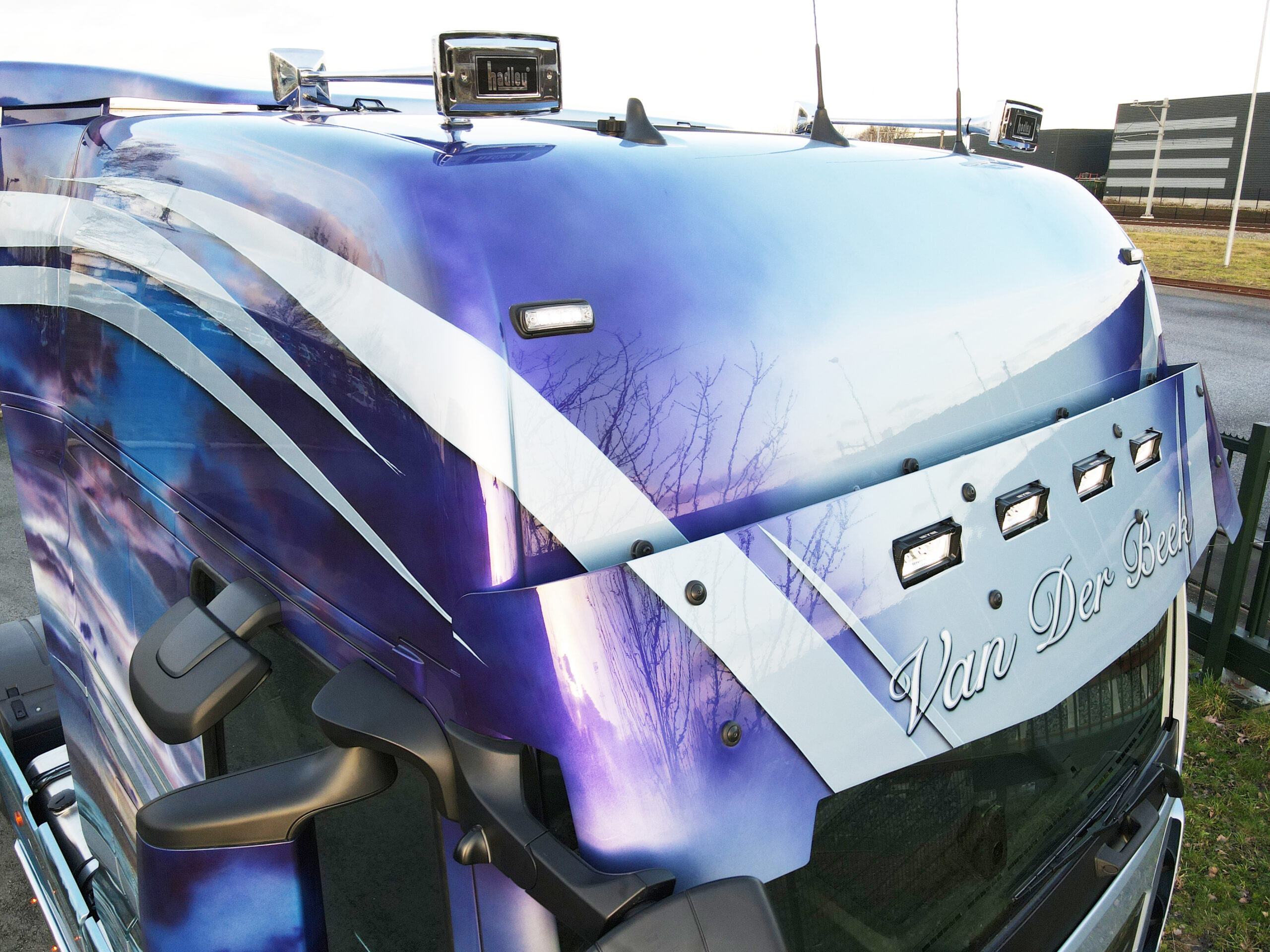 De specialpaint-artiesten Marcel en Willeke, eigenaren van ‘MW Designs’ in Schijndel, hebben deze truck een meer dan opvallend uiterlijk gegeven. Geheel naar wens van Natasja is de zonsopkomst, geïnspireerd op de akkers van Zevenbergschen Hoek, gecombineerd met licht gespoten paarse striping. De vrachtwagen is volledig met de hand geairbrushed en aan ieder detail is gedacht. De zonneklep is ontworpen door ‘Van der Heijden Truckstyling’ uit Boxtel. Hier zijn de LED-verstralers verwerkt in de zonneklep zodat de stroomlijn behouden kon worden. De zonneklep is opgenomen in het airbrush-design zodat deze één is geworden met de vrachtwagen.