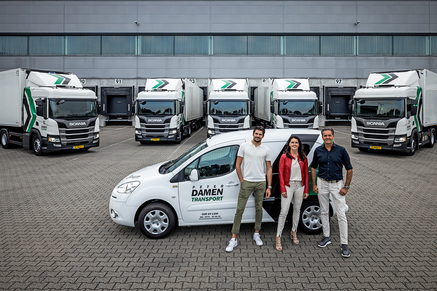 - Vijf nieuwe Scania P410 distributietrekkers voor Peter Damen Transport. V.l.n.r. Koert, Jeannette en Peter Damen.