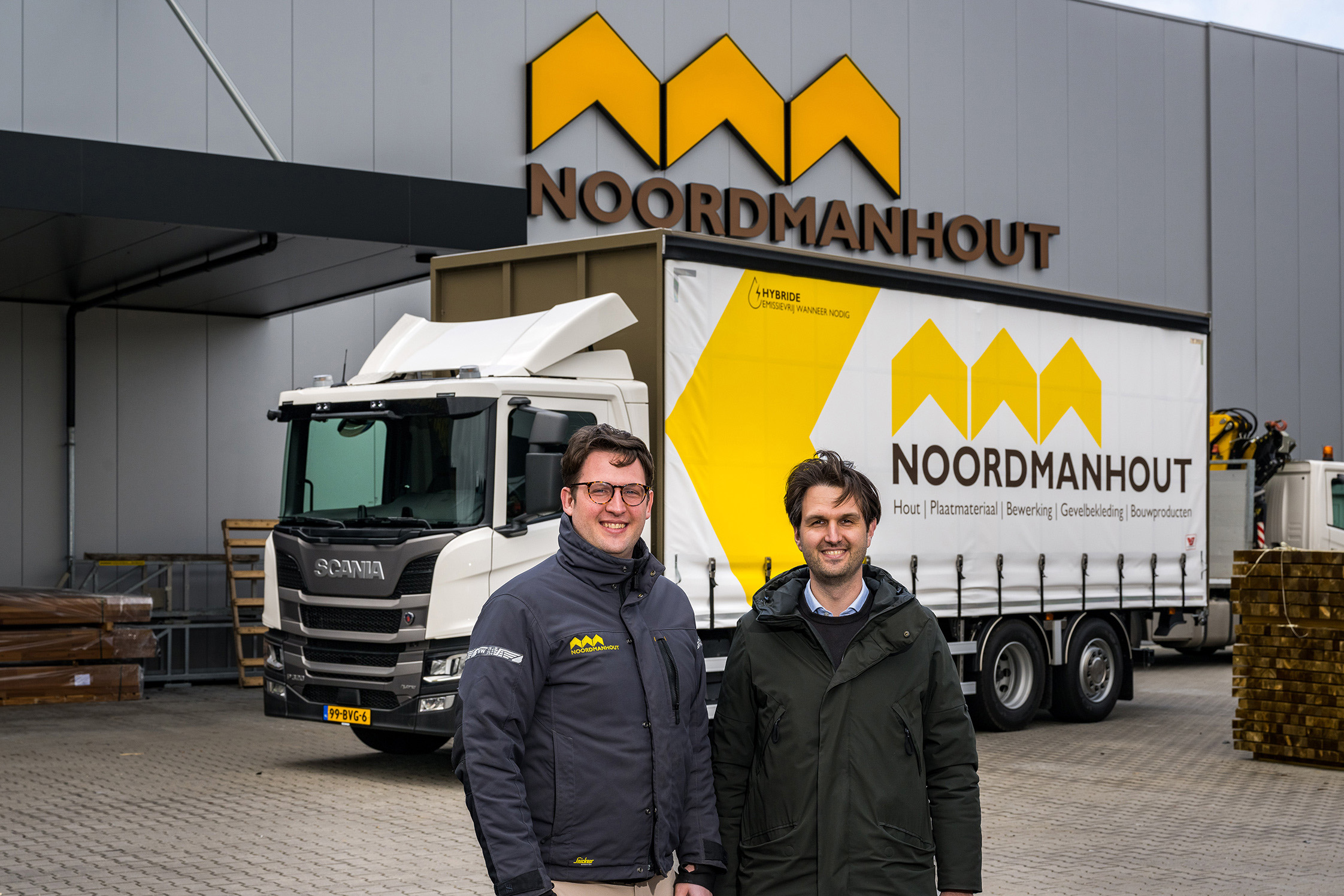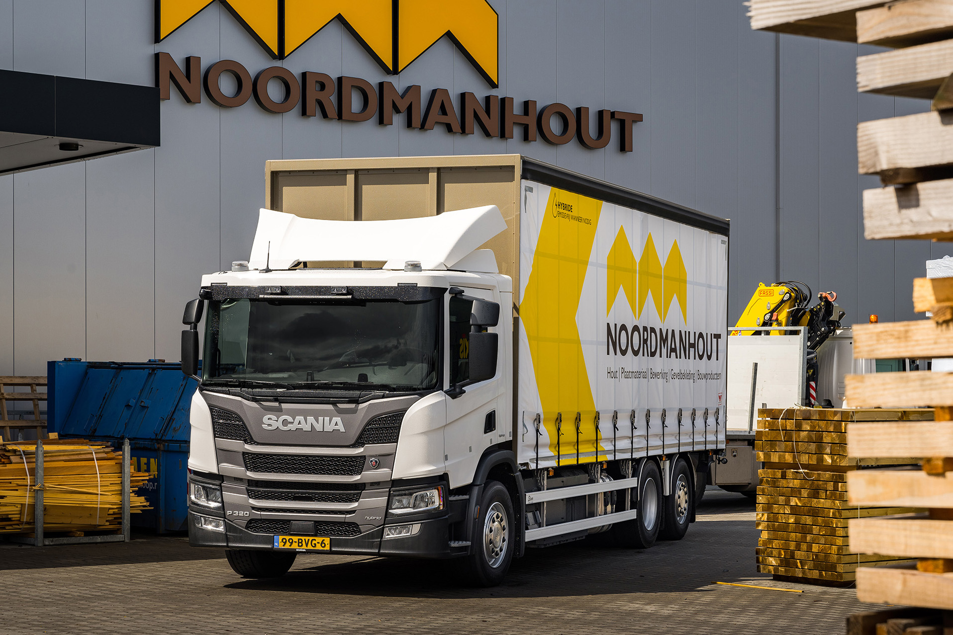 De truck, voorzien van schuifzeilopbouw en meeneemheftruck, is de eerste Scania met hybride aandrijving in Leiden én de Bollenstreek. De broers Alexander en Max Noordman vormen de zesde generatie van Houthandel Noordman. Met een klein wagenpark wordt vanuit de vestigingen in Leiden en Oegstgeest een veelzijdige klantengroep beleverd. Alexander Noordman legt uit dat de Euro 5-motor van één van de twee trucks het balletje aan het rollen bracht. “Om onze klanten in de stad te kunnen bedienen zonder steeds een ontheffing te hoeven aanvragen, zijn we ons gaan oriënteren op alternatieve brandstoffen en aandrijflijnen.”