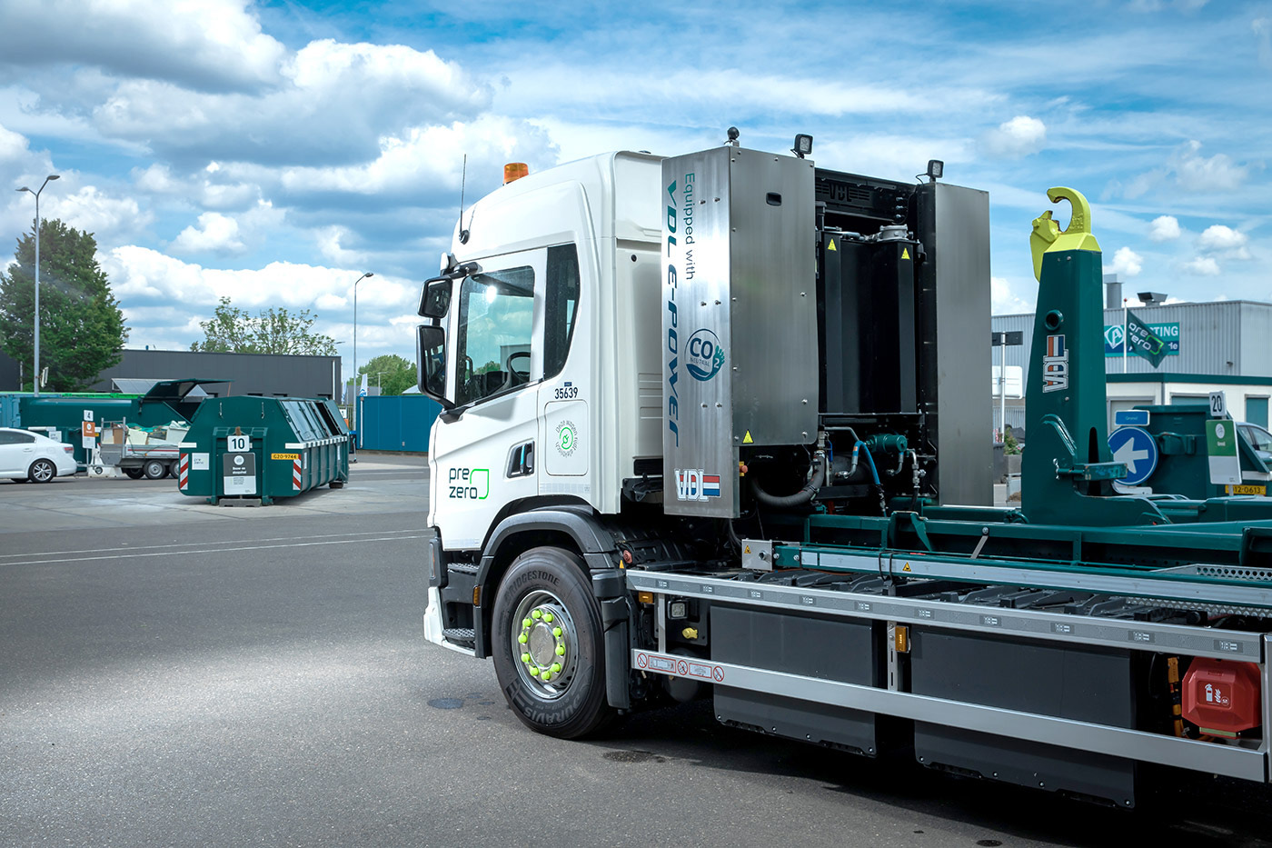 De nieuwe Scania-trucks zijn uitgerust met een e-PTO. Dit is in dit geval een elektrische aansluiting in het frame. De opbouwer kan hier spanning afhalen met een maximaal vermogen van 60 kW om de opbouw, zoals in dit geval een haakarmsysteem dat wordt opgebouwd door VDL Groep, elektrisch aan te drijven. De trucks kunnen dus onder alle omstandigheden volledig zero-emissie opereren.