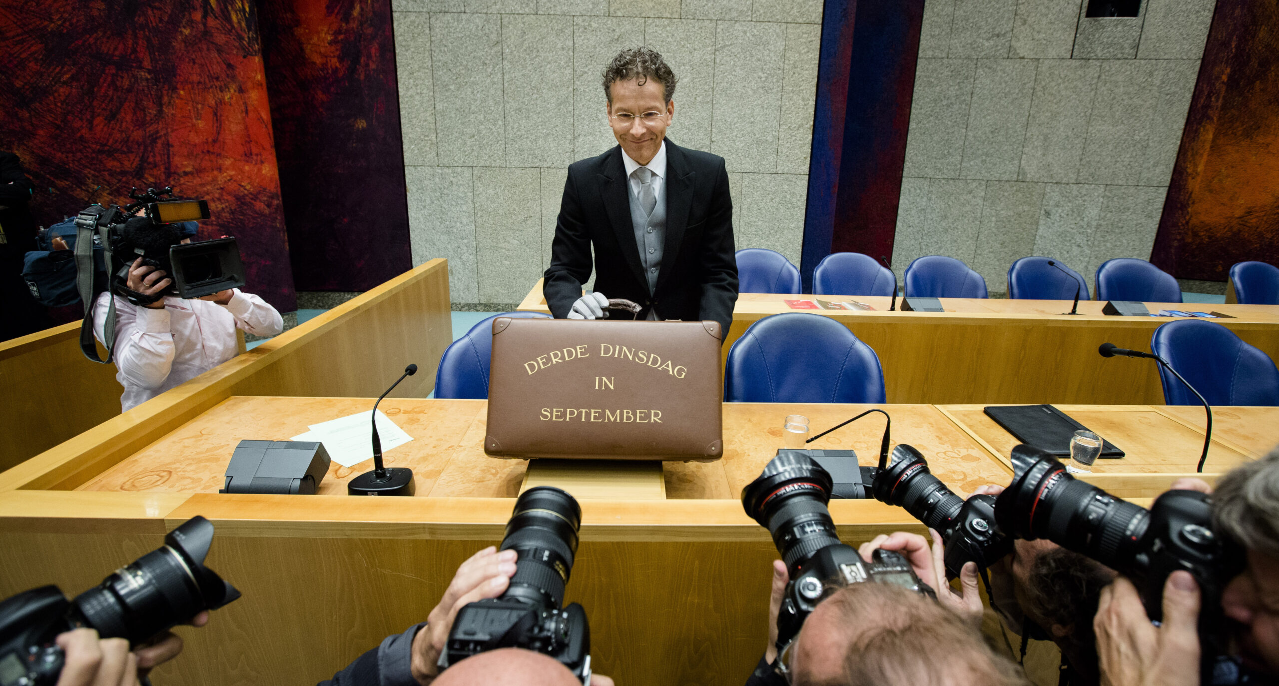 Openingsfoto: Minister Jeroen Dijsselbloem van Financiën presenteert het koffertje van de Miljoenennota. (ANP)