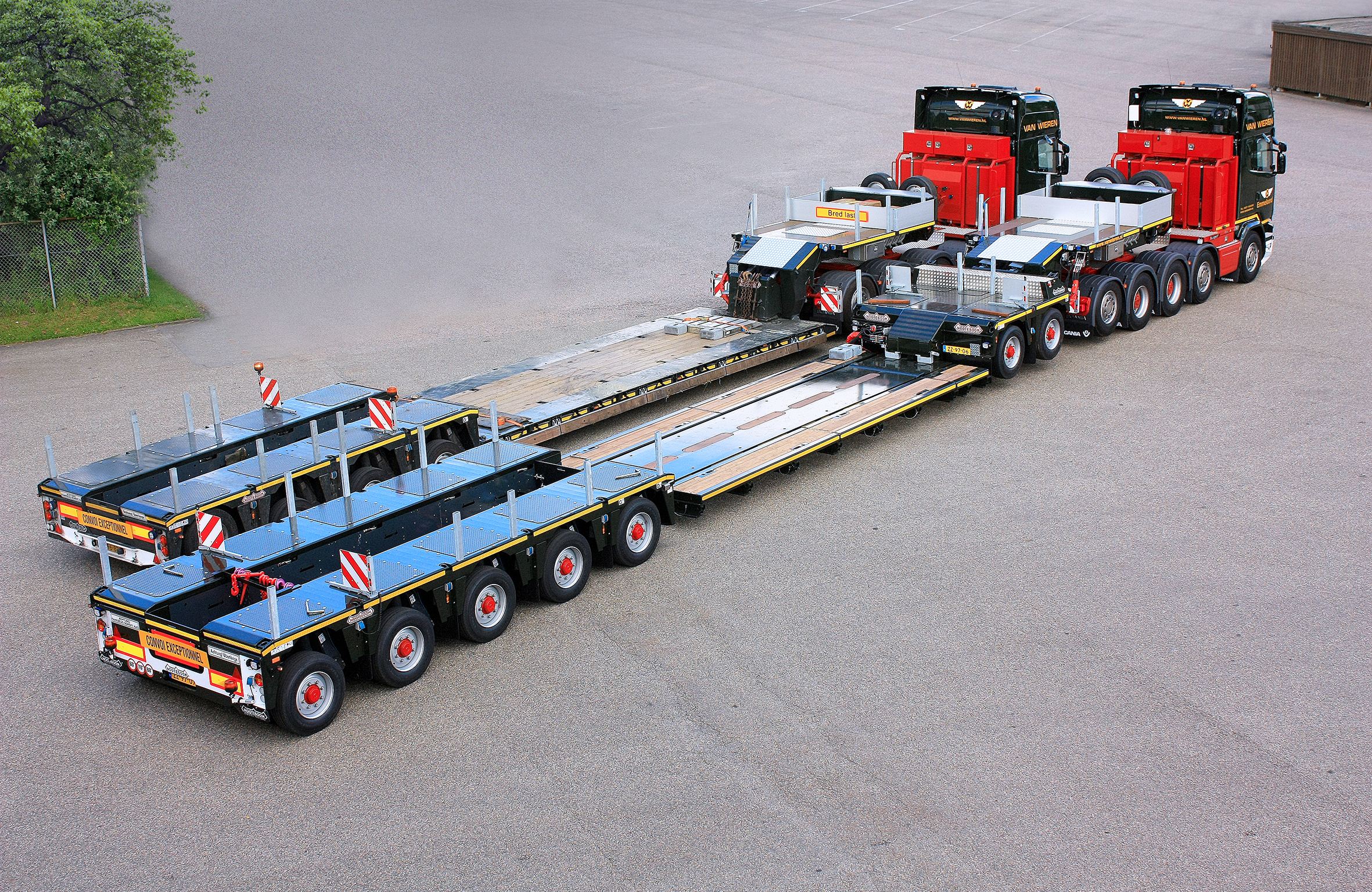 Het gaat om twee vijf-assige Scania trekkers met 730 pk V8-motor, die worden gecombineerd met Nooteboom Pendel-X diepladers voor de allerzwaarste klussen.