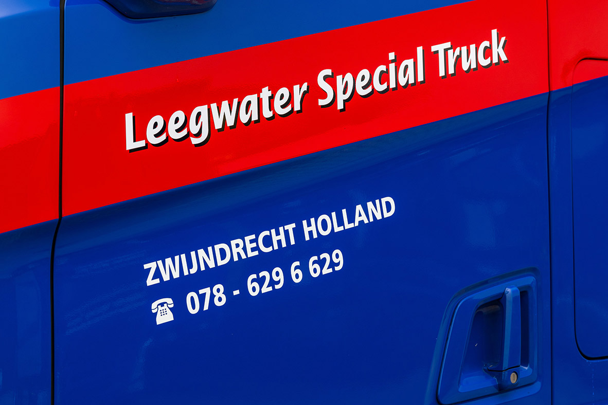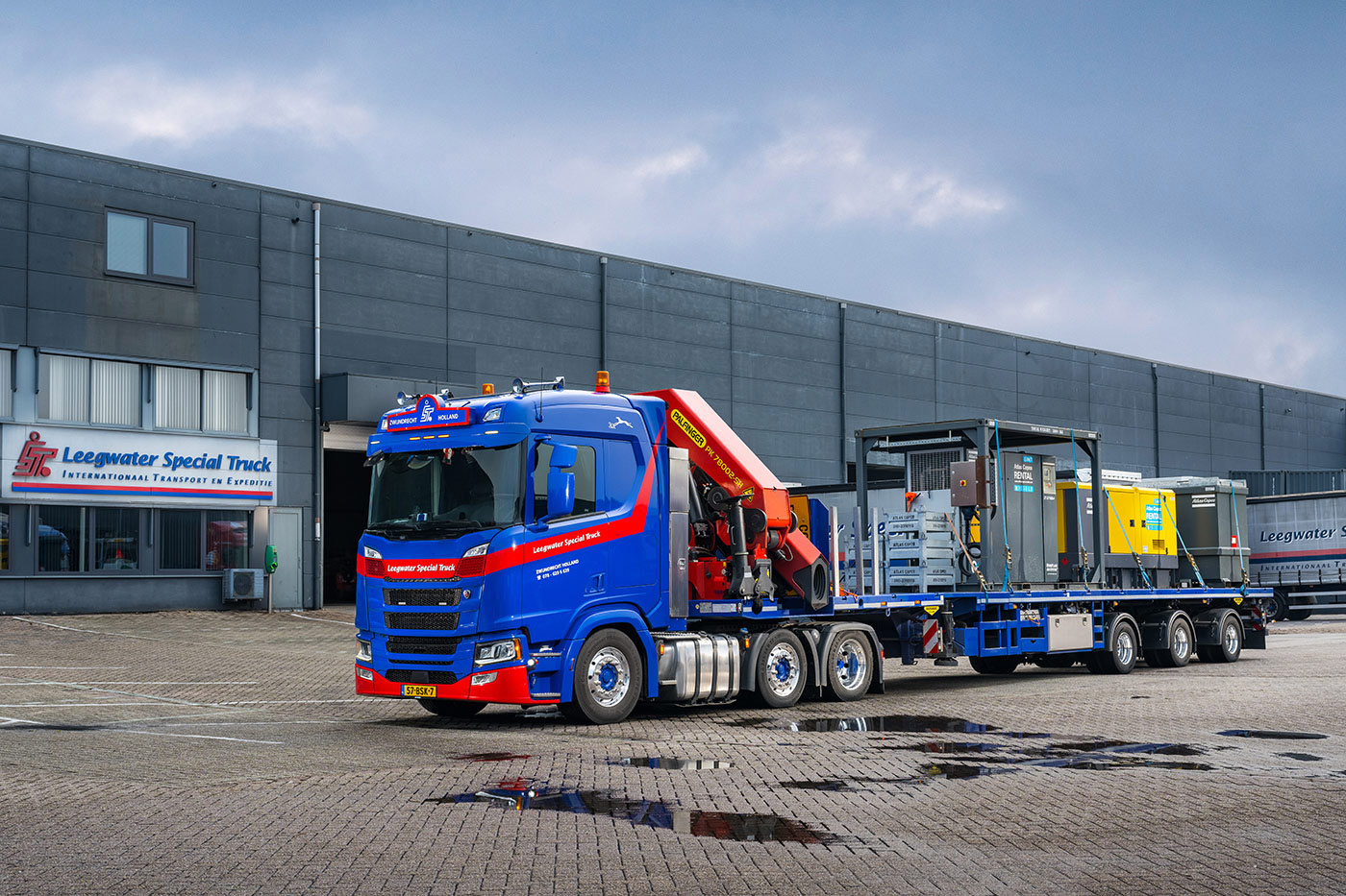 “Wij zochten een combinatie die zo flexibel mogelijk in te zetten is”, vertelt eigenaar directeur Sander Leegwater. “Wij zijn behalve gespecialiseerd in kraanwerk, ook actief in veel andere transporttakken van het vervoer van koeriers werk door geheel Europa, pallet distributie, vervoer van gevaarlijke stoffen, stukgoed tank en vervoer van afvalstoffen en containers. Dus moest onze nieuwe truck zowel optimaal kunnen kranen als voor een gewone trailer kunnen. De oplossing was een trekker met een laag 96 cm chassis, een gestuurde voorloopas én een schuif- en hefbare schotel.”