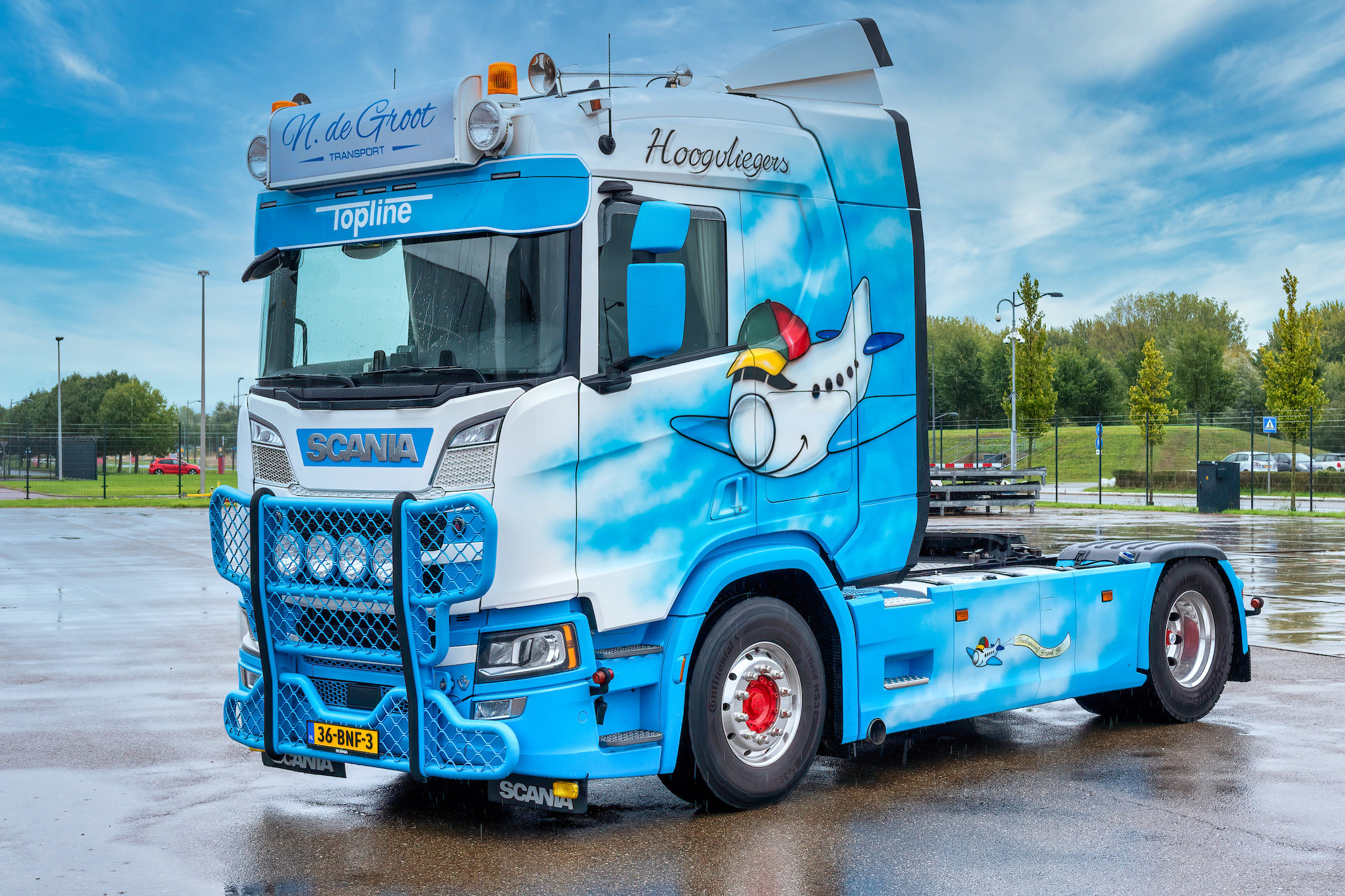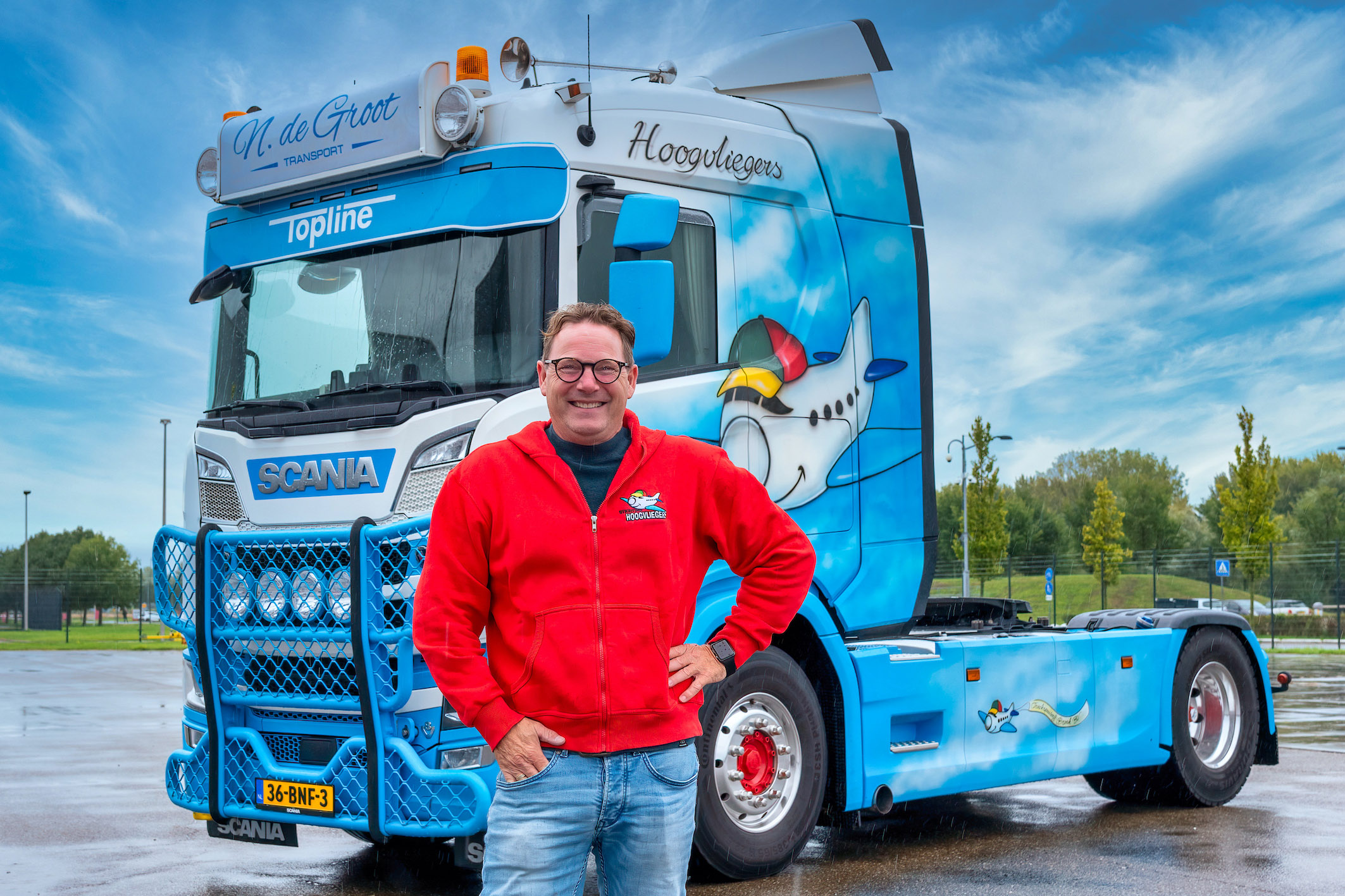 Eén van de vaste vrijwilligers is Cor van Aalst. Al jaren is hij betrokken bij Stichting Hoogvliegers als chauffeur en als vrijwilliger. Begin dit jaar ontving Cor een tijdelijke truck, in afwachting van de levering van een nieuwe truck. Tijdens de eerste Hoogvliegersdag dit jaar in Eindhoven, bleek deze leentruck wel erg te matchen met de trailer van Stichting Hoogvliegers die hij naar Eindhoven bracht. Zijn werkgever, N. de Groot Transport uit Nederhemert, zag de foto’s en werd ook enthousiast. Hij wilde graag ook een steentje bijdragen aan de Trucks voor Hoogvliegers, maar Cor zou een nieuwe truck krijgen.