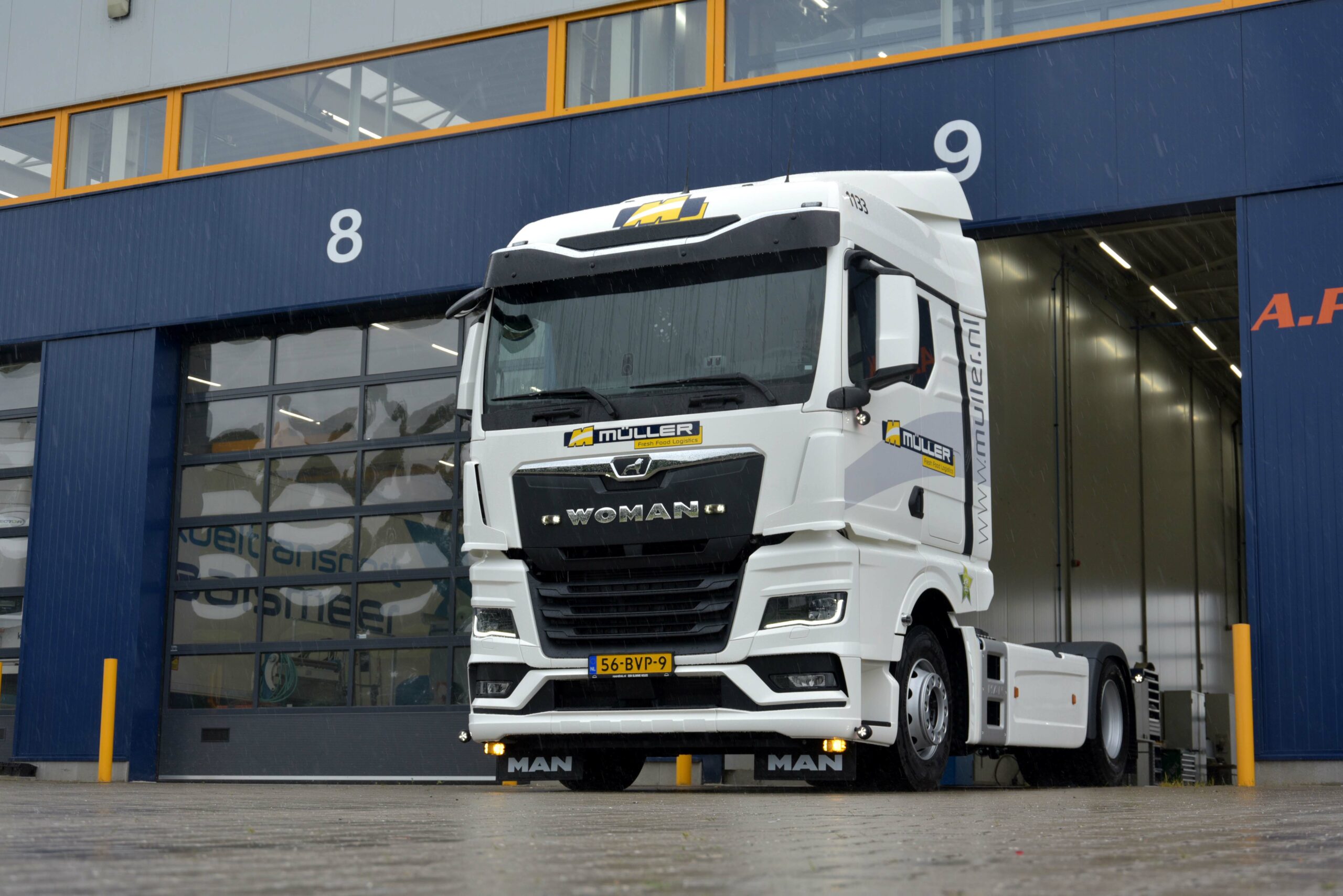 De aangepaste grille met de letters WOMAN werd in samenwerking met MAN Truck & Bus en huisdealer Roordink gemaakt. Fleur is er heel blij mee en voor haar laat het zien dat Müller zijn chauffeurs serieus neemt. “Ik rij al twintig jaar waarvan zes jaar voor Müller. Hier word je ook als vrouw serieus genomen als chauffeur en dat is voor mij een enorme bevestiging.”