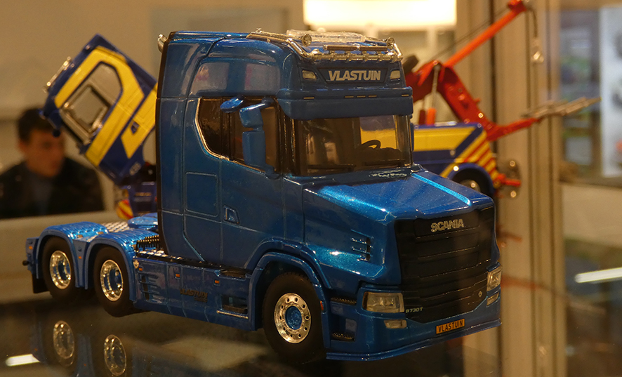 Vorig jaar verraste NZG met een enorme Mercedes Actros in 1:18 met naar keuze een containerchassis erachter of een autotransporter. Nu staat er op de stand een nog grof handmodel van de volgende 1:18 trekker, de Scania Next Gen. Te zien is dat het om de hoge S-cabine gaat maar een typeplaatje ontbreekt. Volgens medewerkers moet er nog wat ontwikkelingswerk gebeuren maar men hoopt de Scania begin 2021 op de markt te kunnen brengen.