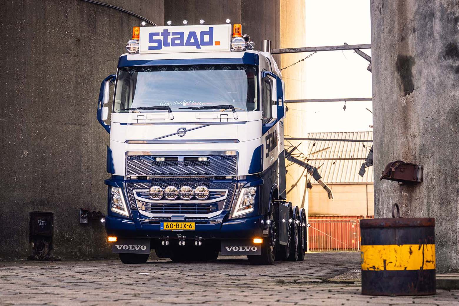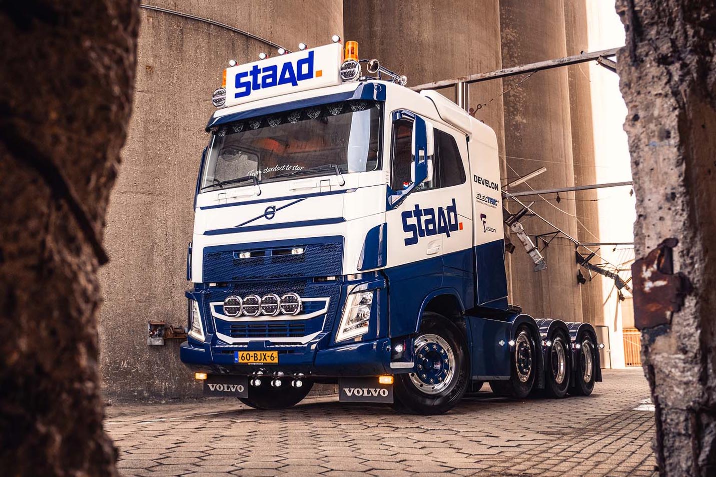 Nadat de Volvo FH 540 was aangekocht, onderging deze direct een complete metamorfose. Het voertuig werd volledig opnieuw gespoten, inclusief het chassis, in de Staad kleurstelling. De opbouw van de wagen werd uitgevoerd volgens de wensen van chauffeur en demonstrateur Frank Verbij, en werd verzorgd door de eigen monteur Jelle. Daarnaast werd het interieur volledig getransformeerd door Truck it Yourself. Er was behoefte aan voldoende werkverlichting voor de vroege ochtenden op locatie en het manoeuvreren in het donker. De nauwe samenwerking met verlichtingsexpert Jurgen van TRALERT® resulteerde in een perfecte afstemming van het verlichtingsontwerp op de behoeften van Staad, met een totaalplan voor optimale verlichting in alle omstandigheden.