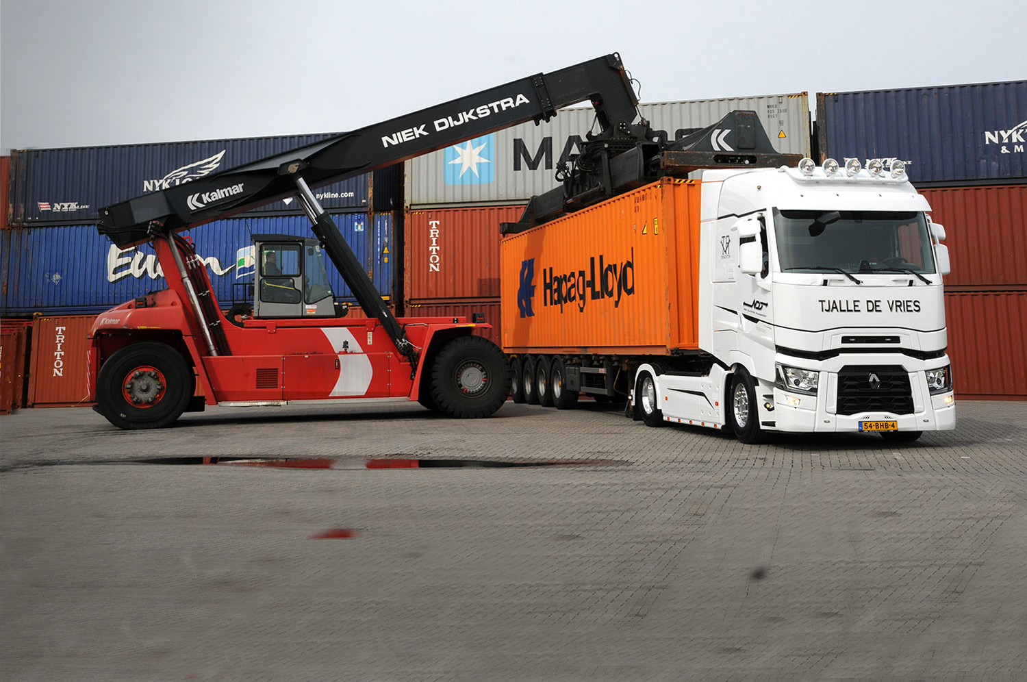 De nieuwe Renault-trekker heeft een opvallende, strak-witte lak en staat op aluminium wielen. Tjalle de Vries zet de nieuwe Renault Trucks T in voor het vervoer van zeecontainers in de Benelux.