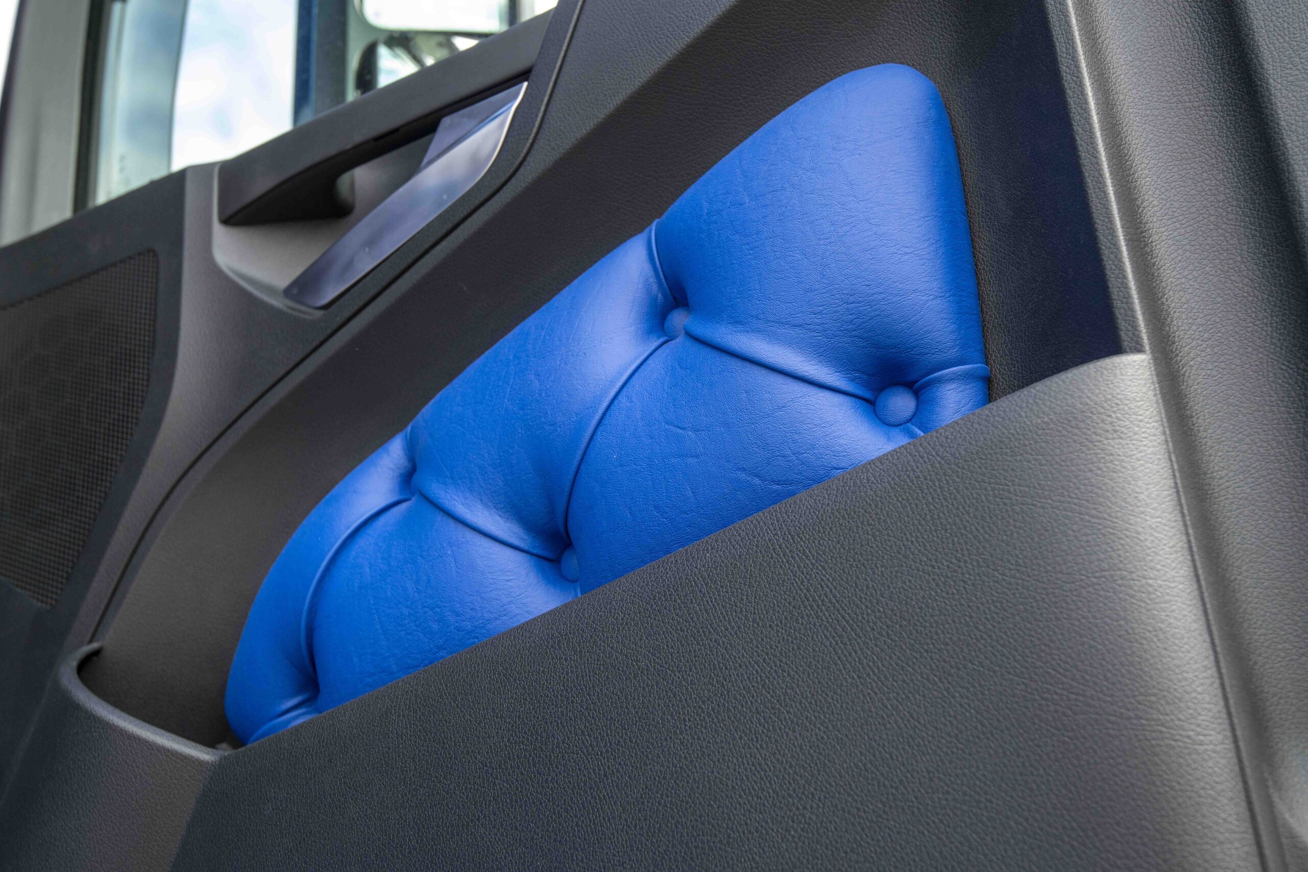 De chauffeurs van Arja Trans mogen op eigen initiatief en kosten ‘hun’ truck verder aankleden naar eigen voorkeuren en inzichten. Ook Niels Otten heeft ruimschoots gebruikgemaakt van deze mogelijkheid. Hij vertelt: “Ik heb het blauwe thema wat doorgevoerd. Zo ligt er in het interieur geen standaard bodembekleding, maar een kunststof vloermat, uitgevoerd in blauw. Verder heb ik blauwe gordijnen laten aanbrengen en de deuren – net als de stoelen – laten bekleden met leder. Bovenop de cabine is er een lichtbakje geplaatst met schijnwerpers ernaast. Al met al staat er een geslaagde, smaakvolle truck die – zeker qua kleur – goed past bij het wagenpark van Arja Trans. Onderweg krijg ik er veel complimenten over, vooral van andere truckers. En nu ben ik ook nog gevraagd de truck tijdens de feestweek hier in het dorp naast een oude Benz neer te zetten. Een mooi compliment vind ik dat!”