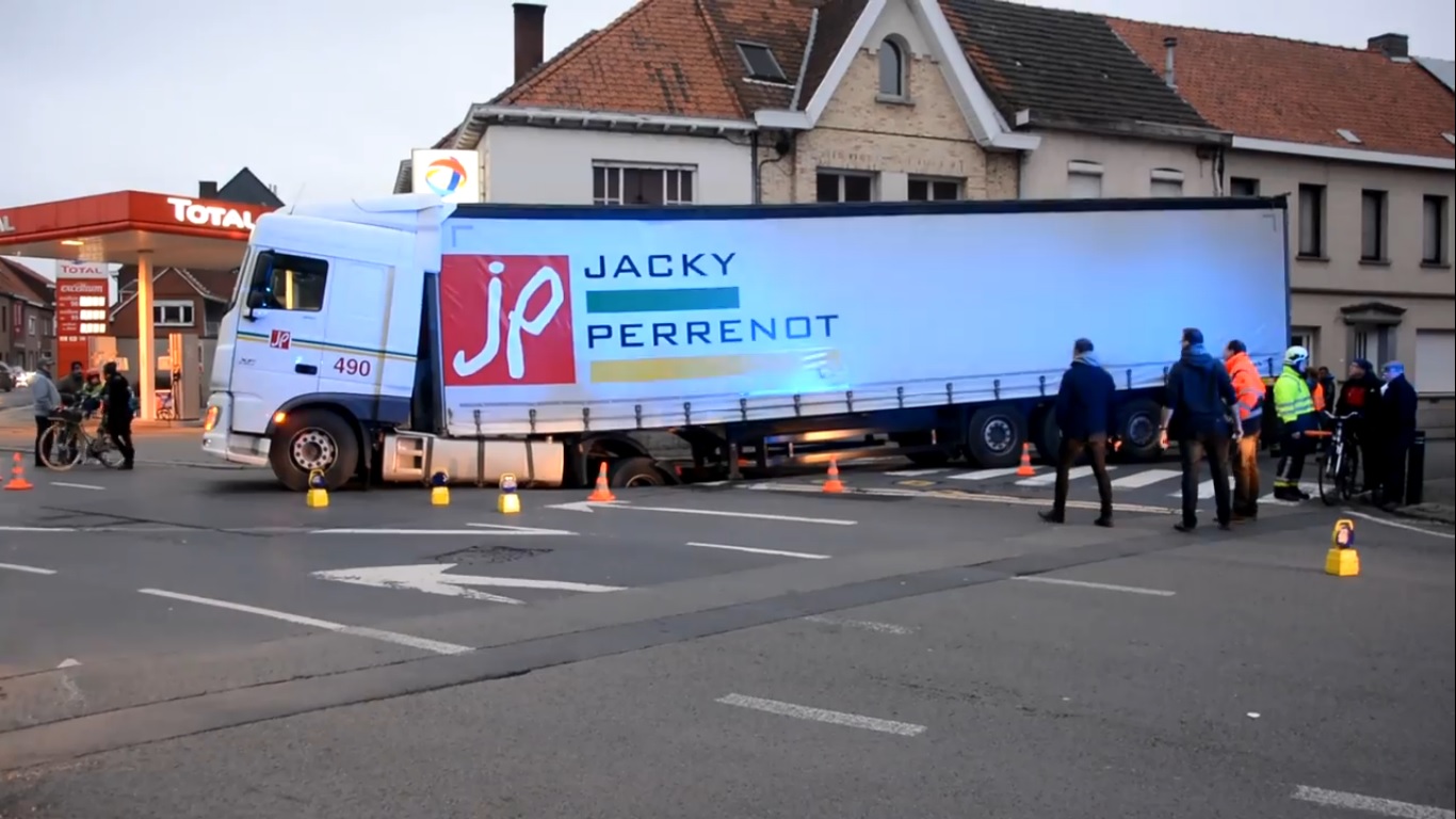In de West-Vlaamse plaats Kuurne is een truck door het wegdek gezakt. Het opmerkelijke incident vond plaats midden op een kruispunt.