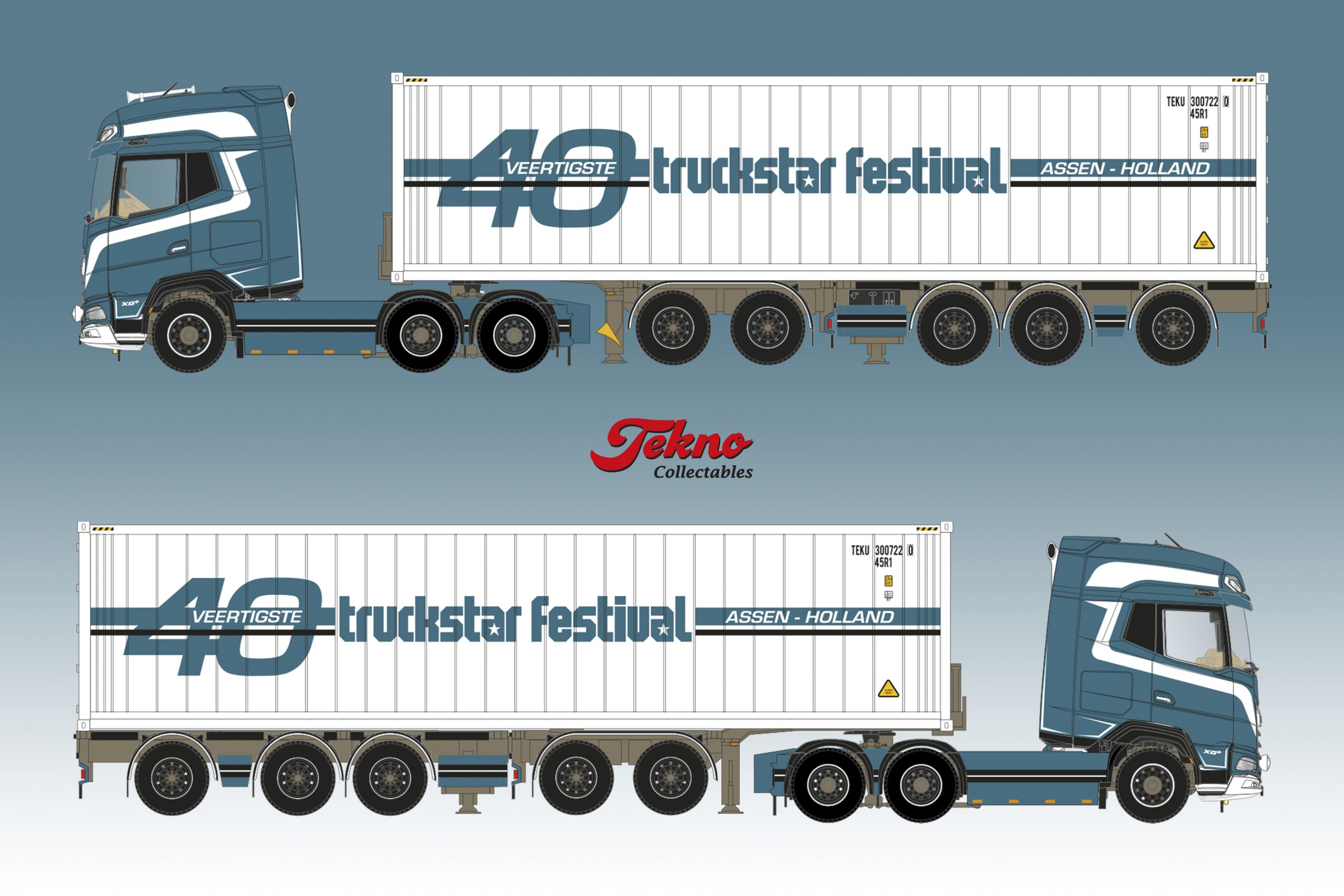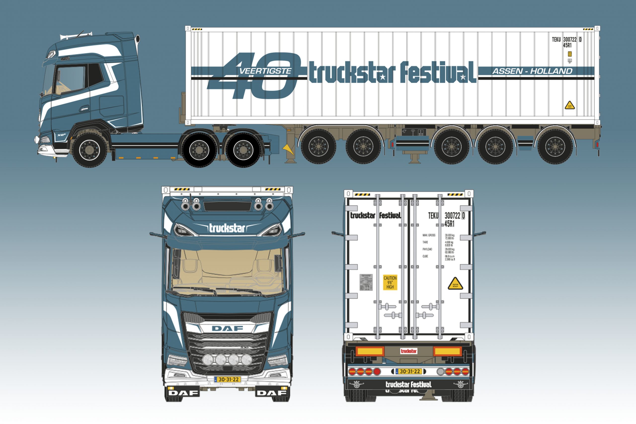Voor deze editie is gekozen voor een DAF XG+ 6×2 530 sleepastrekker voorzien van een 5-assige D-TEC ‘breker’ containerchassis. Op dit chassis bevindt zich een 40ft. high cube reefer container. De trekker is verder voorzien van o.a. luchthoorns, verstralers, spatlappen met dagrijverlichting, staande uitlaten, een groot loopbordes, strings, skirts en een dikke Deense achterbumper. Er staat dus echt iets je vitrine.