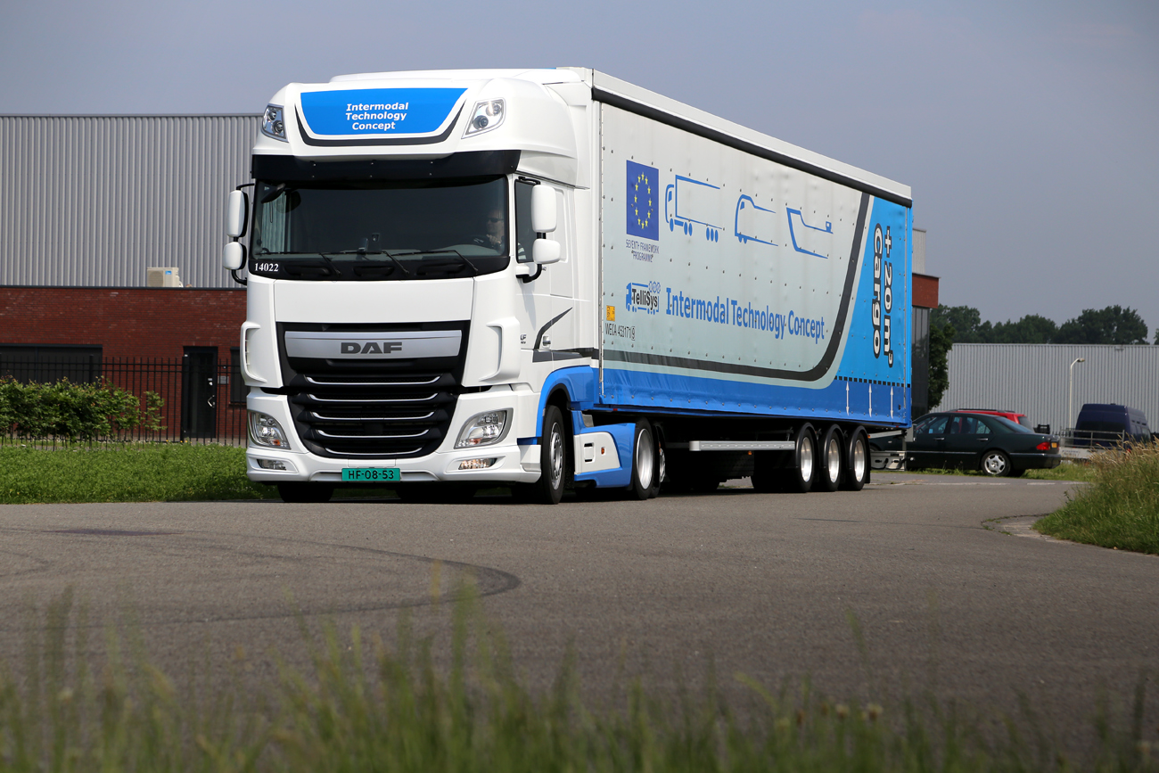 De TelliSys is eigenlijk onderdeel van een iets uitgebreidere vraag dan ‘how low can you go?’ De vraag – in 2012 – was: hoe kun je zo veel mogelijk laadvolume en laadvermogen halen uit een intermodaal transportsysteem dat op de weg binnen de bestaande maximale afmetingen blijft. Daarmee zou namelijk de CO2-uitstoot per vervoerde kubieke meter vracht omlaag kunnen. De EU heeft wel oren naar dit soort initiatieven, en stelde een subisidie beschikbaar.