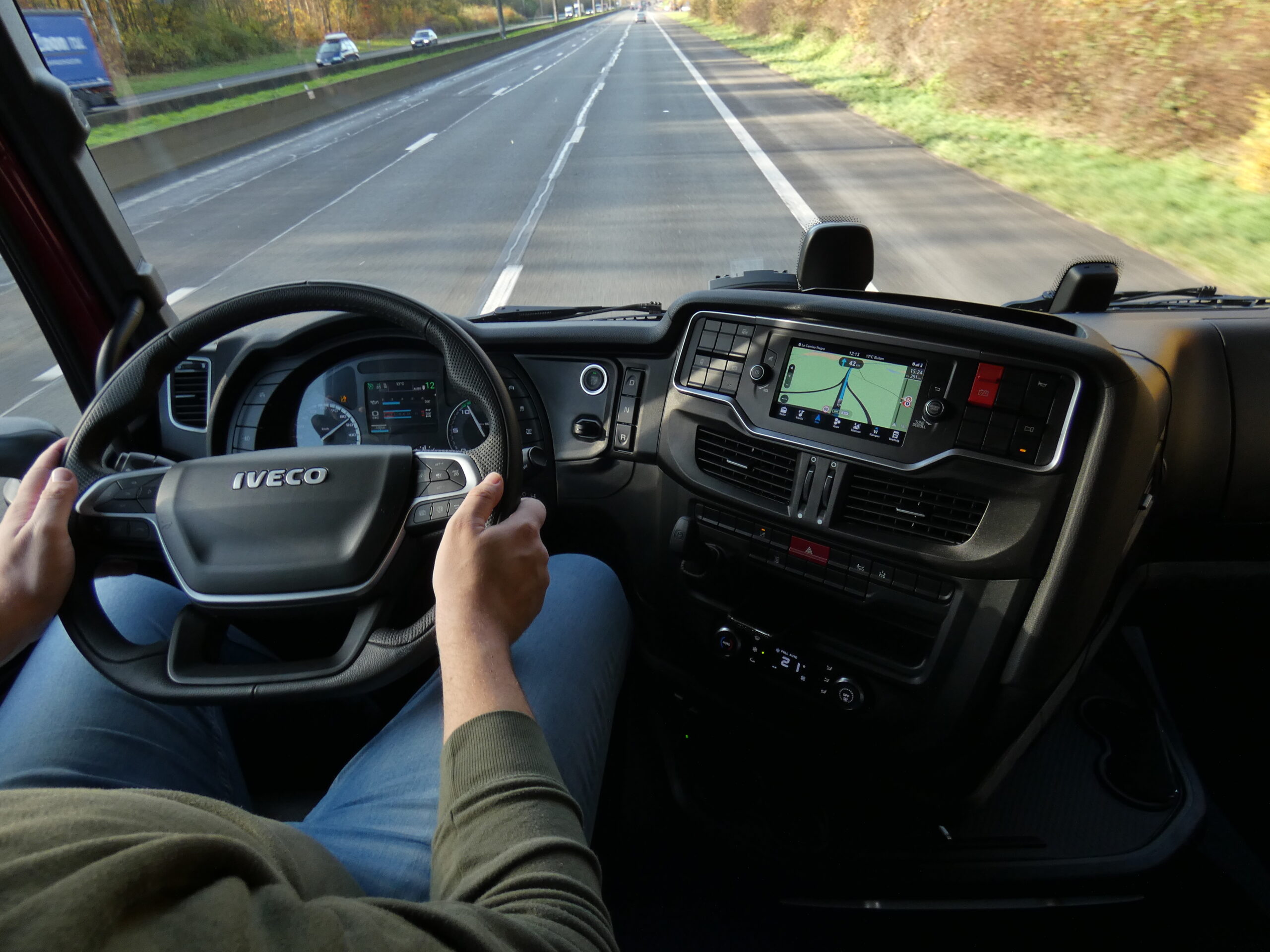 We maken ons op voor een ontspannen rit want er is tijd. We hoeven tenslotte pas eind van de middag in Parijs te zijn. De eerste echte kilometers met de S-Way dienen zich aan als we de A2 richting Maastricht opdraaien. Ik (Robert Servaas) zit goed in de Iveco, op een fijne stoel en met het stuur prima in de hand. Voor het mooie zou dat nog iets meer naar je toe gekanteld kunnen worden, maar het is lekker dik en de onderkant is afgeplat voor wat extra bewegingsvrijheid. De Iveco stuurt lekker stevig en is opvallend stil. We hebben de beschikking over 480 pk, ruim voldoende voor de 15 pallets met papier die we bij ons hebben.