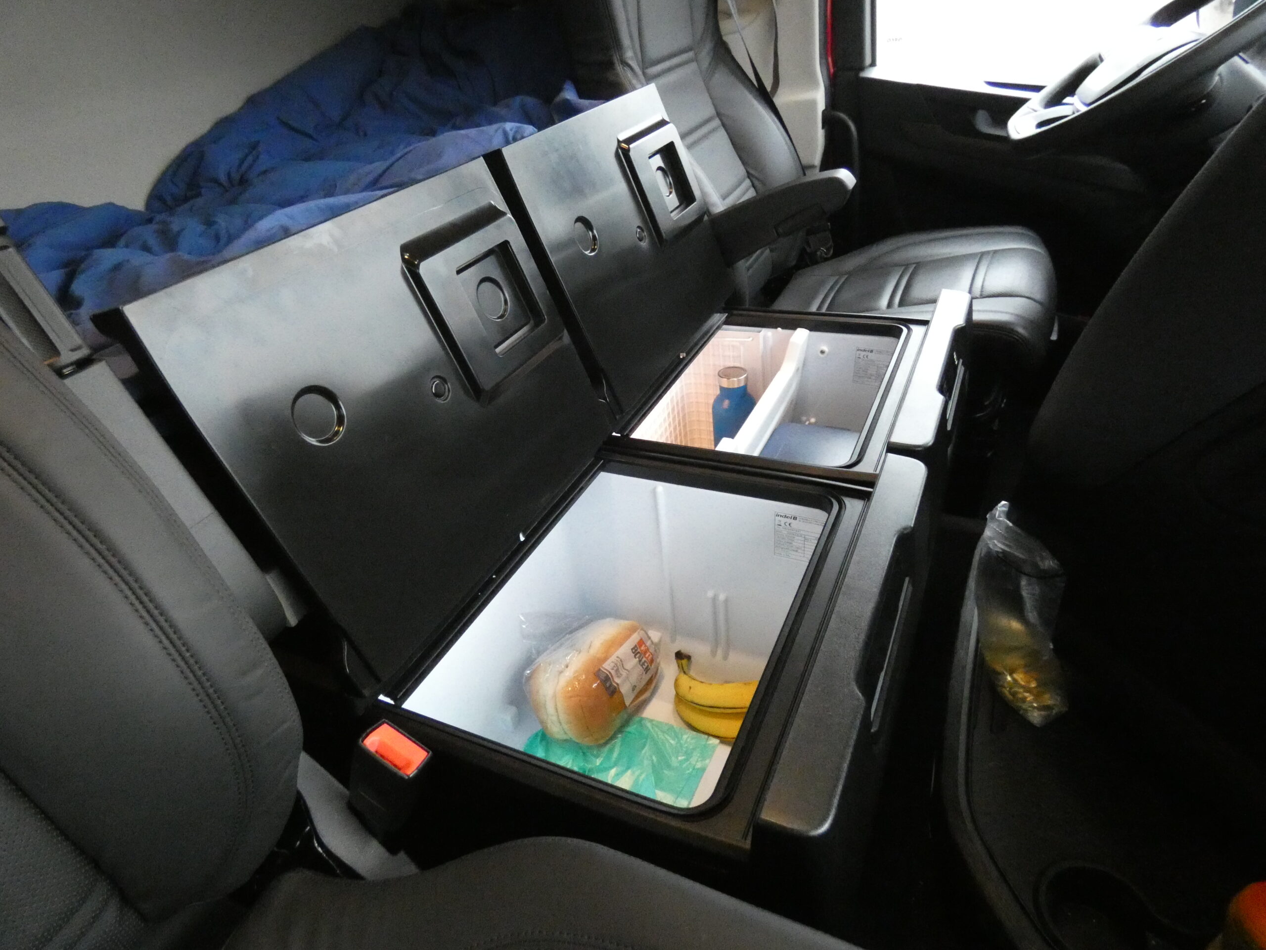 - Onder het bed zitten twee grote kasten, de een is een koelbox, de andere een echte ijskast.