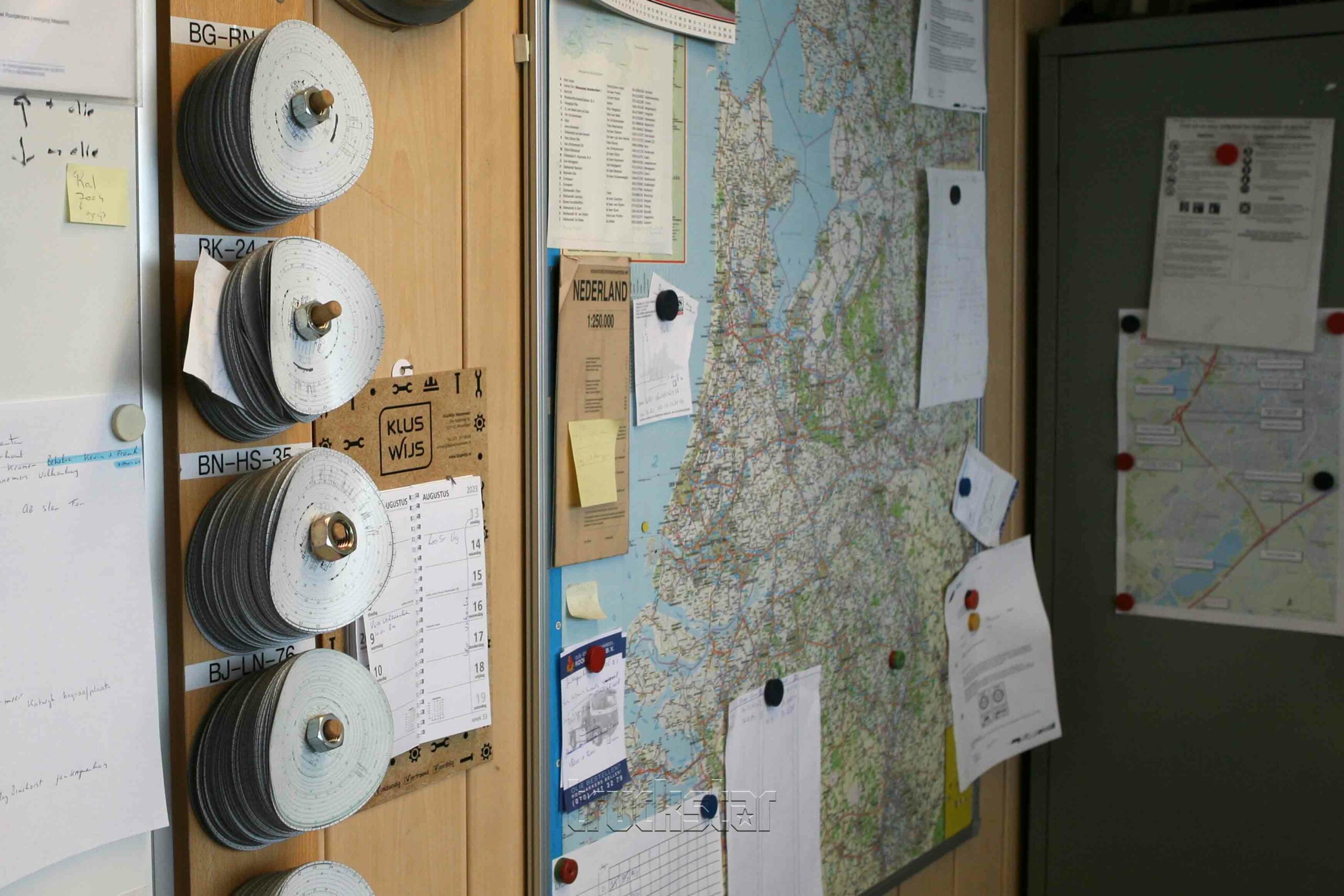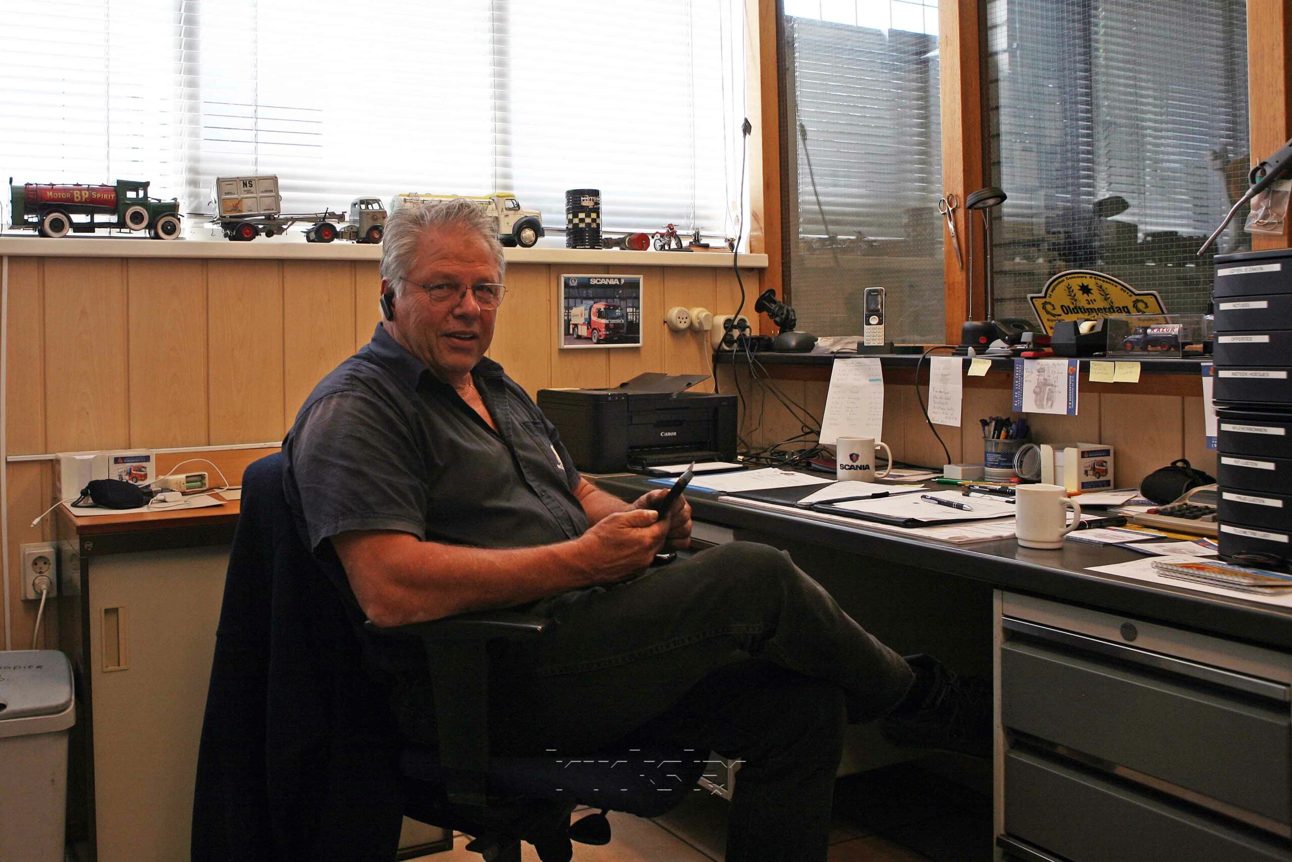 „Alles wordt nog gebruikt”, vertelt Leo in het kantoortje van de loods. Het lijkt alsof de tijd ergens in de jaren zeventig de grip op deze kleine ruimte heeft verloren. Op het robuuste ijzeren bureau van de brandstofhandelaar ontbreekt een computer. Wel staan er op elkaar gestapelde plastic bakjes waar papieren in liggen. Op elk bakje zit een witte sticker met zwarte tekst. Onder meer te lezen op de stickers zijn ‘Actueel’, ‘Lopende zaken’ en ‘Offertes’. Aan een van de wanden hangt een schijvenhouder, die nog altijd in gebruik is. De luxaflex houdt het zonlicht op afstand. Boven de deur naar de garage kijkt Leo senior vanaf een foto toe. Op de vensterbank staan modelletjes van oude tankwagens. „Alles is hier gedateerd”, grapt de 68-jarige ondernemer terwijl hij opstaat vanuit zijn bureaustoel. „Het echte kantoor, waar de administratie wordt gedaan, staat elders in Wassenaar”, zegt hij daarna op serieuze toon. Daar staan wel computers. „De lezers moeten niet de indruk krijgen dat we niet met onze tijd meegaan”, zegt Leo lachend. Het bedrijf heeft drie vestigingen in Wassenaar. Naast deze locatie zijn er nog twee tankstations. In totaal staan er negen mensen op de loonlijst.