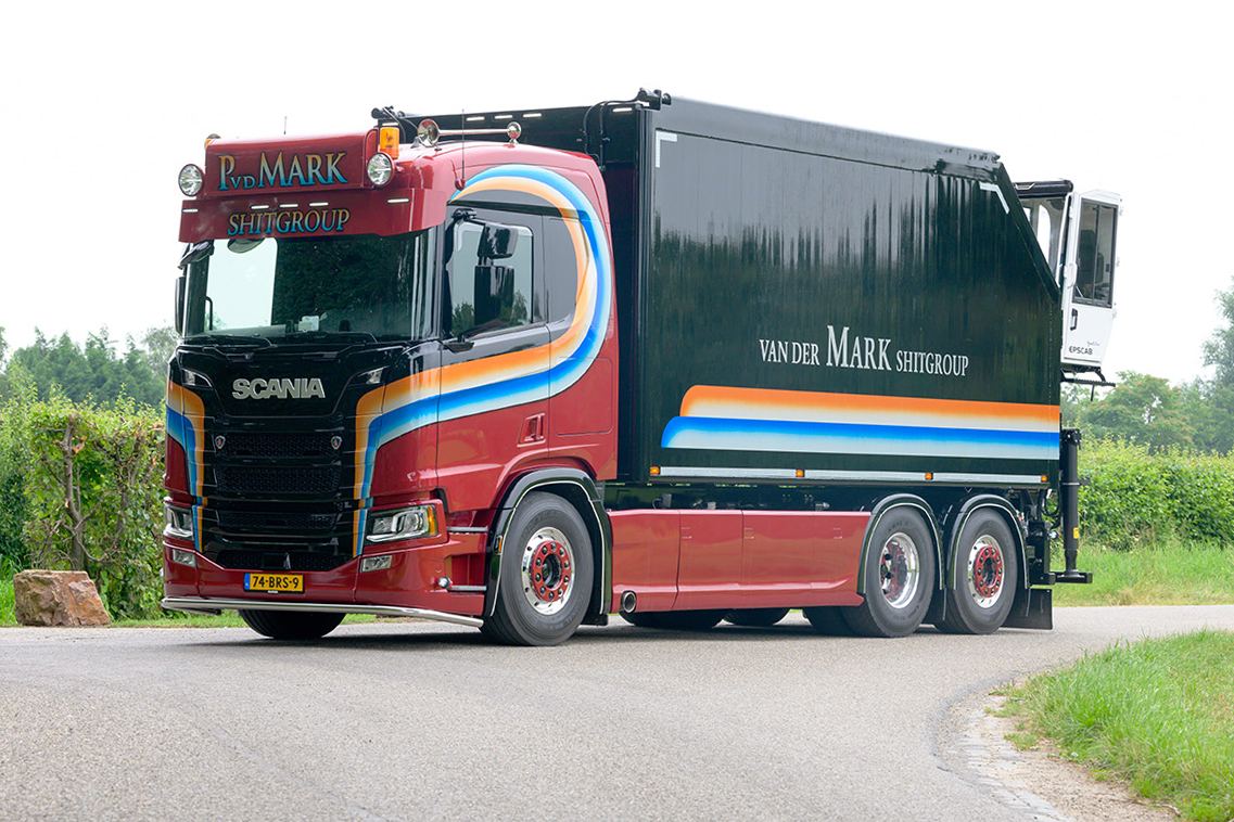 Van der Mark heeft de naam dat het bedrijf heel veel liefde, energie en tijd in het verfraaien van zijn trucks steekt. “Jaja, en dat samen met dikke V8 motoren”, weet Patrick. “Onze kleuren doen we nog steeds. Dat is al sinds 1979 ons handelsmerk. En nog steeds kiezen we voor een rijke uitrusting. Maar dat zit toch meer in comfort als luchtvering, standkoeling, retarder, goed geluid en uiteraard leren bekleding. Dat laatste doen we overigens vooral omdat je leer over de jaren heen beter schoonhoudt. Je kunt nog zo voorzichtig en netjes zijn: het gebeurt natuurlijk toch een keer dat er iets mee naar binnenkomt. Maar vroeger verbouwden wij de cabine helemaal om er bijvoorbeeld mee naar festivals te gaan. Dat wordt toch minder want ook hier wordt het wel steeds rationeler. Het gaat bij ons ook steeds meer om het laadvermogen.”