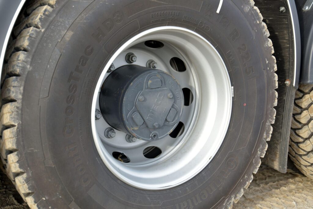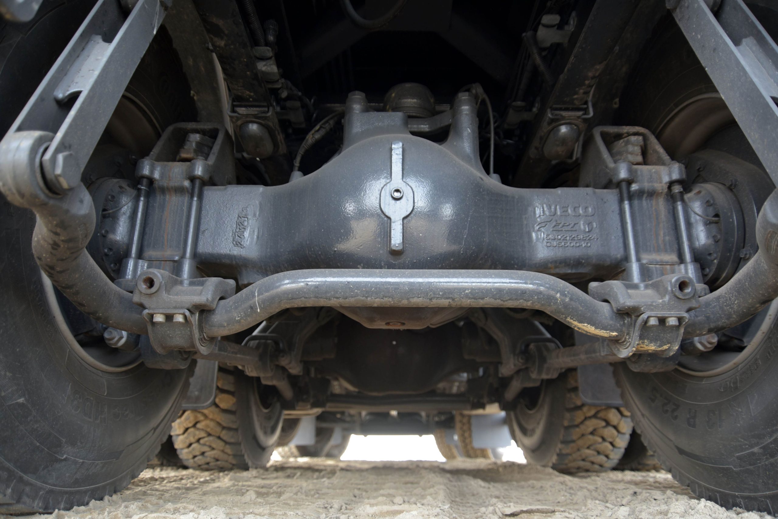 Afgezien van de luchtgeveerde, middelste as is het chassis volledig parabool geveerd. Daarmee is de Iveco vooral een robuust voertuig met lage onderhoudskosten door de eenvoudige bouw. Toch heeft het comfort niet te lijden onder deze keuze. De truck rijdt zelfs in onbeladen toestand opvallend comfortabel. Voor een korte draaicirkel werd wielbasis ingekort en de uitlaat aan het chassis verplaatst. Verder werd er een verplichte front underrun protectie (FUPS) aangebracht onder de bumper.