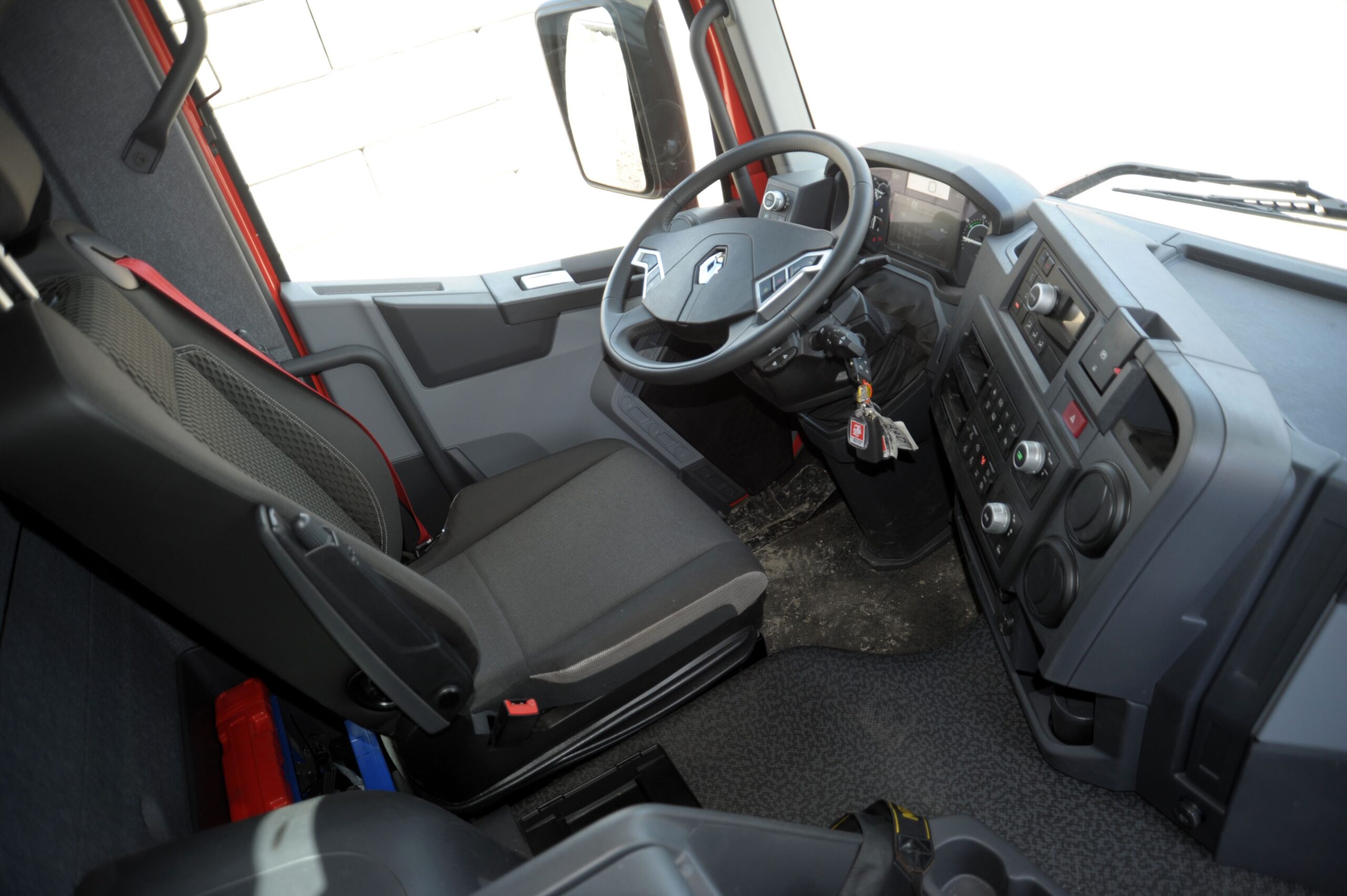 De nieuwe 10×8 ziet er bijzonder robuust uit met zijn stalen bumper met een grote oploophoek, de stoere, ruime cabine en typische bouw accenten zoals de beschermde koplampen. Verder is er een opstap met een handgreep aangebracht achter de linker deur waardoor de chauffeur tijdens het laden in de bak kan kijken. Het interieur van de K is typisch Renault. Dat wil zeggen robuust en functioneel en daarmee bij uitstek geschikt voor het zwaarste werk.