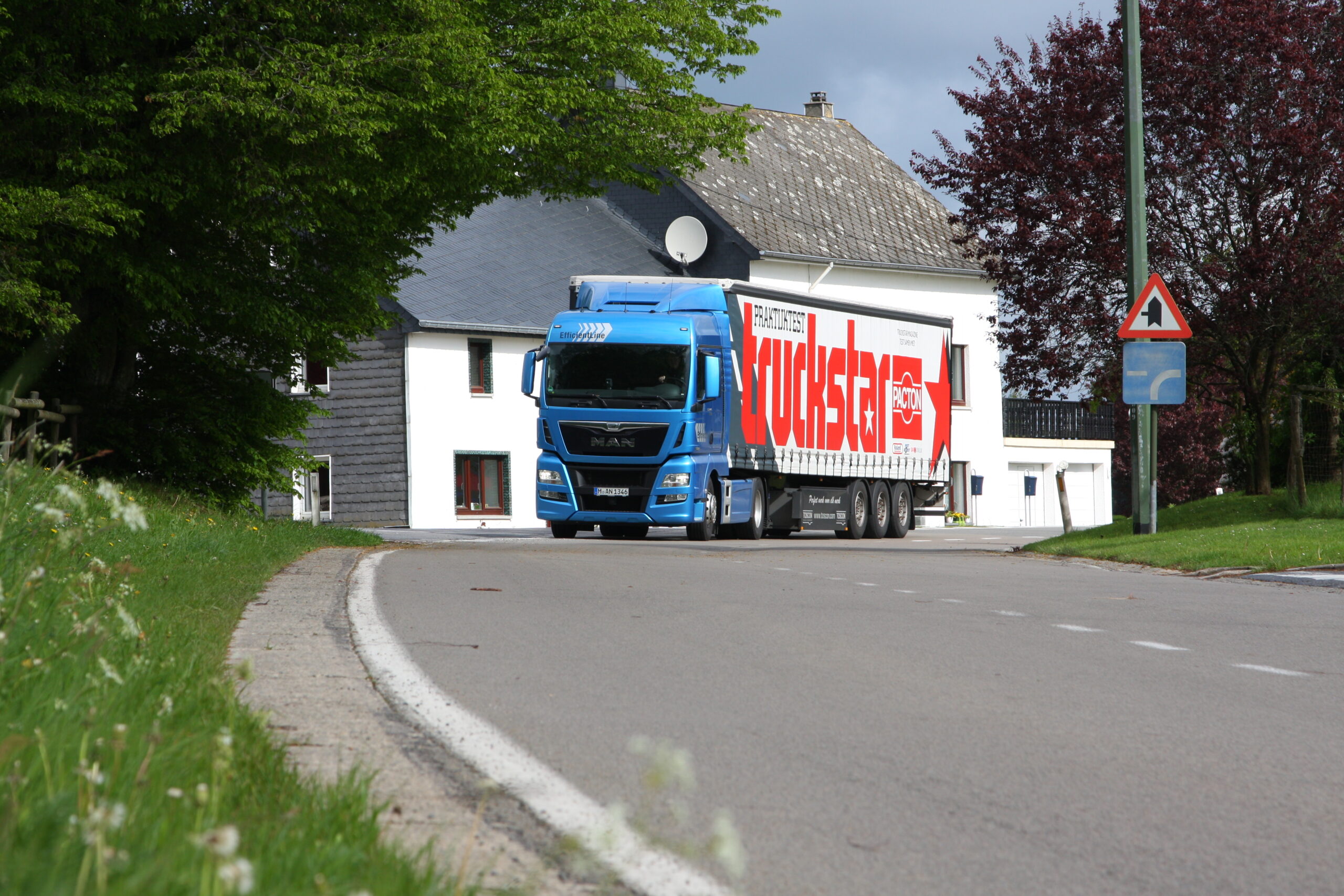 Genoeg over het uiterlijk: we gaan rijden. Daarbij openbaart zich een aangename verrassing, want de cabine deint en beweegt veel minder dan vroeger. Prettig, en volgens onze Duitse MAN-begeleider het gevolg van beter afgestelde luchtveren onder de cabine. Ook prettig is het sturen (maar dat wisten we al). De ACC-gegevens zijn goed zichtbaar op de bekende klokkenwinkel. We gaan testen op onze Ardennenroute naar St. Vith en draaien daartoe bij Asten de A67 op en rijden dan via Eindhoven en de A2 richting Luik.