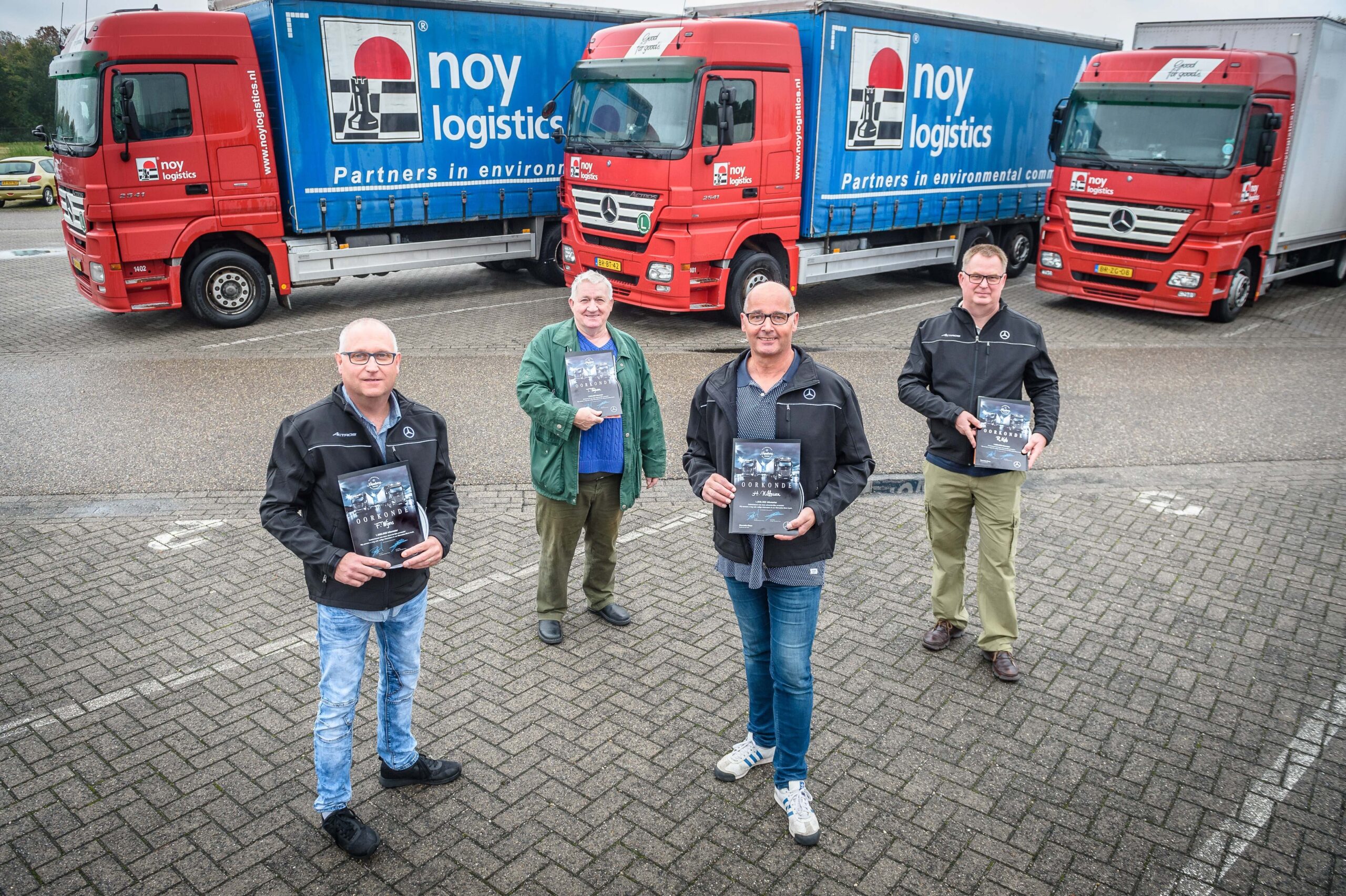 Het rijden van een miljoen kilometer staat volgens berekeningen van het transportbedrijf gelijk aan 25 keer de omtrek van de aarde. Bij elkaar reden de chauffeurs Han Nikkessen, Ton Thijssen, Ruud Koks en Fred Weijers dus ruim honderd keer de wereld rond voor Noy Logistics. Deze prestatie viel bij de Nederlandse Mercedes-Benz importeur in goede aarde.