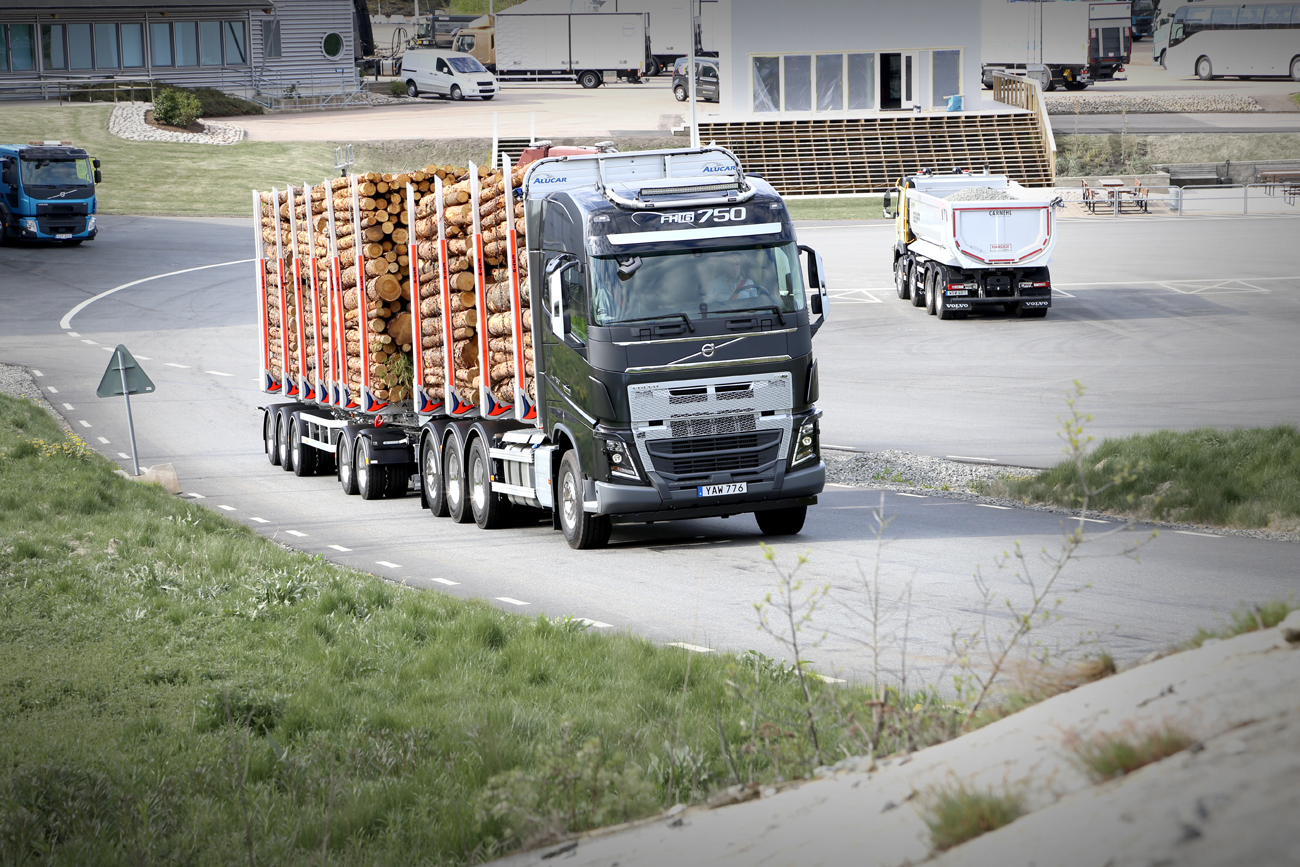 Langzaam draaien we onze zware, hoog opgeladen negen-assige bomencombi een ruime bocht door. Het bord met daarop ‘12%’ komt dichterbij. “Geef maar gas bij”, klinkt het in het Zweeds naast ons. De zware 16 liter onder de cabine komt prachtig hoorbaar en zeer voelbaar tot leven, en sleurt onze 78 ton met plezier de helling op. “Bij die pilon mag je stoppen”, zegt de Volvo testchauffeur.
