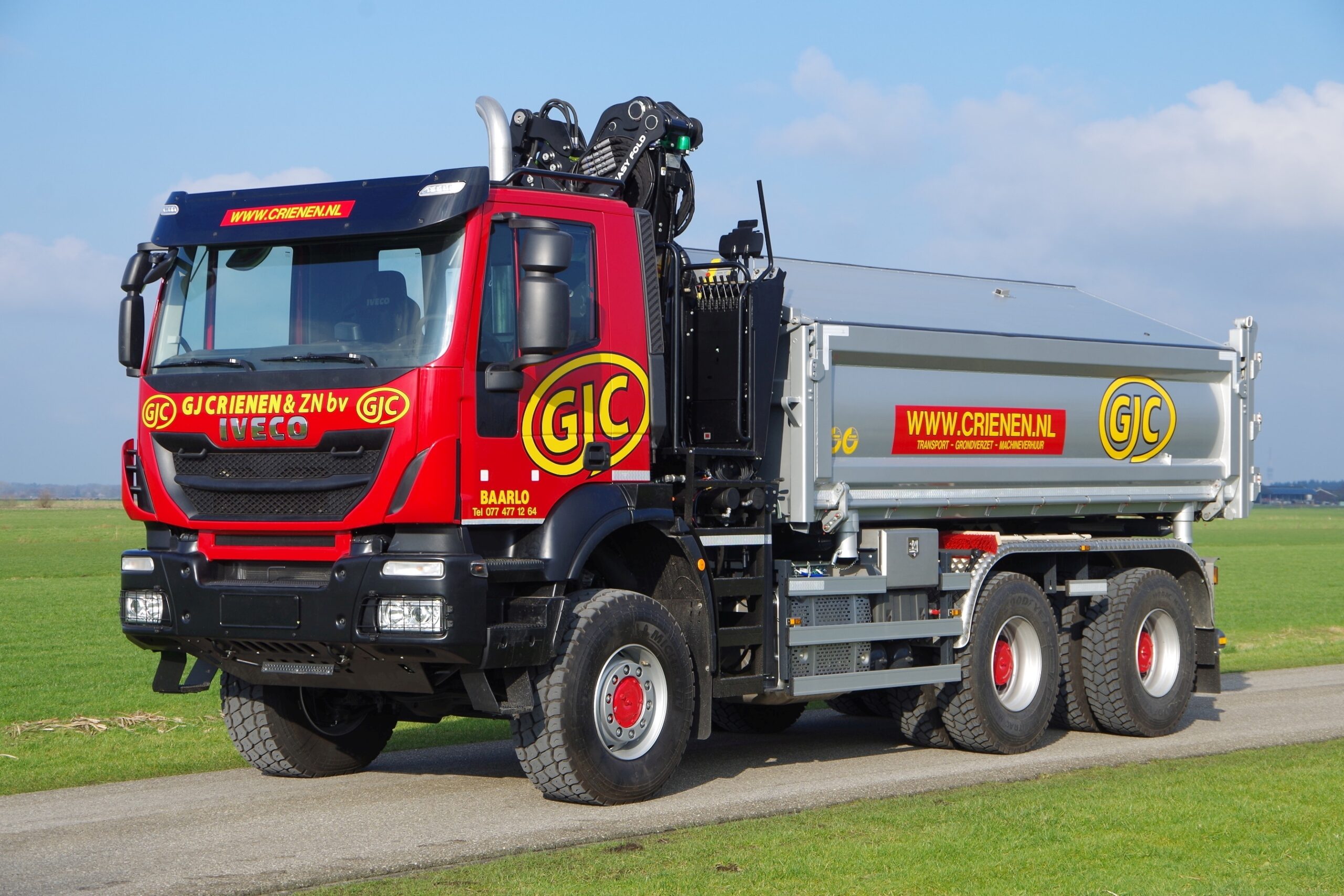 De IVECO Trakker van G.J. Crienen is voorzien van een Palfinger Epsilon Q180Z – Kipperkraan gemonteerd met een Bakker grijper, model DDV EZ 090. Tevens is de auto voorzien van een tweezijdige kipper met afdekschotten. De afdekschotten worden bedient door een hydromotor in het kopschot, zodat er gemakkelijk met een heftruck geladen kan worden.