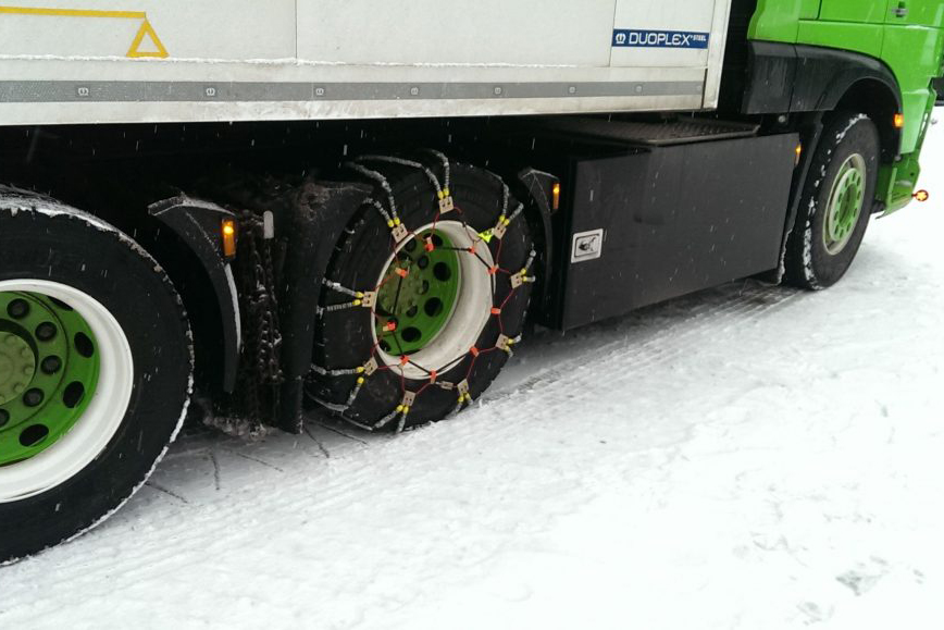 Vrachtwagens zonder aanhanger of oplegger en bussen met meer dan acht zitplaatsen moeten zijn voorzien van sneeuwkettingen op minimaal twee aangedreven wielen, of winterbanden op minimaal twee wielen op de stuuras en op minimaal twee wielen op een aangedreven as. Vrachtwagens met aanhanger of oplegger dienen onder winterse omstandigheden te zijn voorzien van sneeuwkettingen op minimaal twee aangedreven wielen, ook als de combinatie is voorzien van winterbanden.